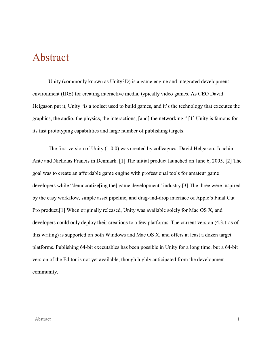 Unity的第一个版本(1.0.0)由丹麦的David Helgason、Joachim Ante和Nicholas Francis等同事创建。[1]首款产品于2005年6月6日推出。[2]目标是为业余游戏开发人员创建一个具有专业工具且价格合理的游戏引擎,同时“使游戏开发行业民主化”。[3] 这三人的灵感来自苹果的Final Cut Pro 这款产品简单的工作流程、简单的资产管道和拖放界面。[1]最初发布时,Unity仅适用于Mac OS X,开发人员只能将其产品部署到少数平台。当前版本(本文撰写之时为4.3.1)在Windows和Mac OS X上都受支持,并且提供了至少12个目标平台发布64位可执行文件的功能,这一功能已经在Unity中实现了很长一段时间,但64位版本的编辑器还不可用,尽管开发社区对此寄予厚望。