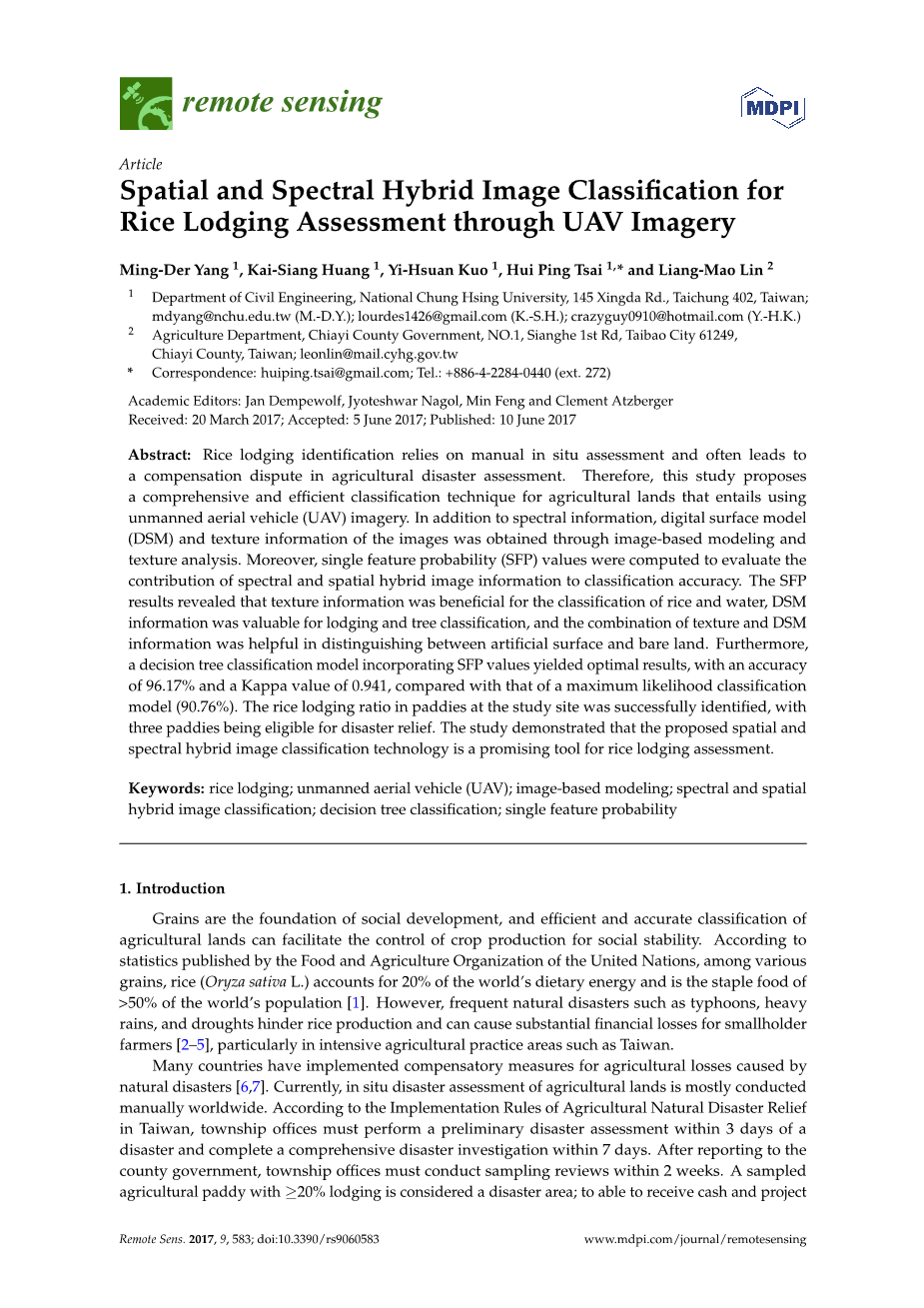 本研究提出了一种综合有效的水稻倒伏解译方法,将空间和光谱混合图像分类技术应用于无人机图像。研究地点为近日在台湾南部遭遇农业损失约306公顷农作物田。具体地说,收集了空间信息,包括从无人机图像生成的DSM获得的高度数据和站点的纹理特征。除了站点的原始光谱信息外,还计算了表征无人机图像每个像素的光谱特征的单特征概率(SFP),以表示基于像素值和训练样本的概率度量。通过融合空间和光谱信息,使用最大似然分类(MLC)[38,39]和决策树分类(DTC)[40]评估分类精度。最后,将所提出的混合图像分类技术应用于研究点内受损稻田,对水稻倒伏率进行了解译。