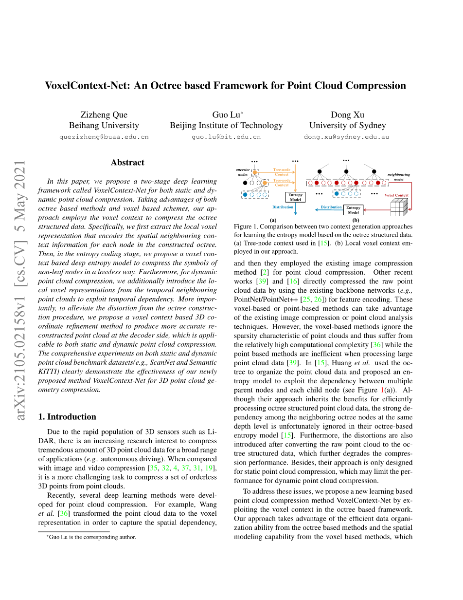 在本文中,我们提出了一个名为 VoxelContext-Net的两阶段深度学习框架,用于静态和动态点云压缩。方法综合了基于八叉树和基于体素的方法的优点,利用体素上下文对八叉树结构数据进行压缩。具体地说,我们首先提取局部体素表示,对构造的八叉树中每个节点的空间相邻上下文信息进行编码。然后,在熵编码阶段,我们提出了一种基于体素和文本的深度熵模型,以无损的方式压缩非叶节点的符号。此外,对于动态点云压缩,我们还引入了来自时间邻近点云的局部体素表示来利用时间依赖性。更重要的是,为了减轻八叉树构造过程中的失真,我们提出了一种基于体素上下文的三维坐标细化方法,在解码器侧生成更精确的重构点云,适用于静态和动态点云压缩。在静态和动态点云基准数据集如(ScanNet和Semantic KITTI)上的综合实验清楚地证明了我们新提出的体素VoxelContext-Net用于三维点云几何压缩的有效性。