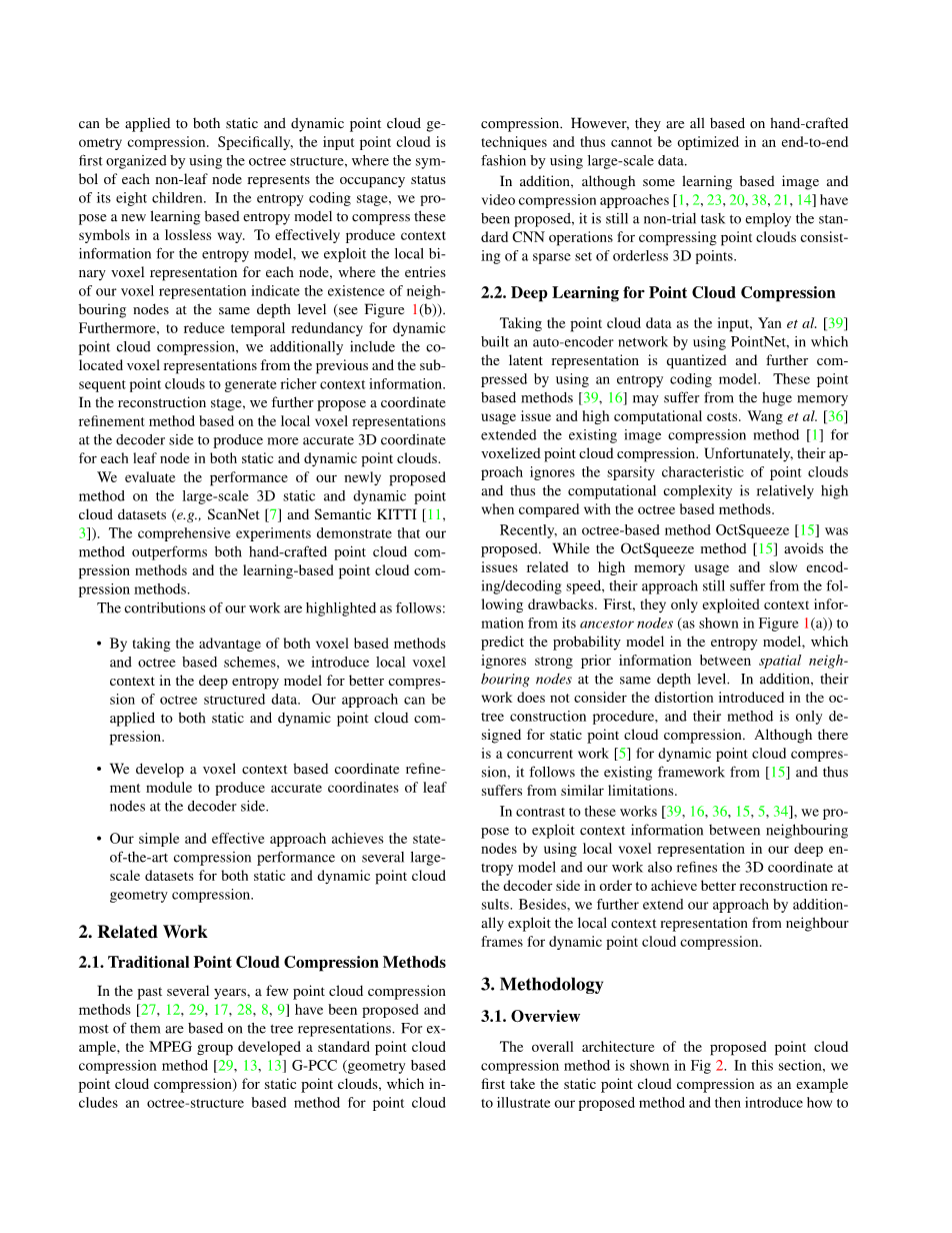 此外,虽然已经提出了一些基于学习的图像和视频压缩方法[1,2,23,20,38,21,14],但使用标准的 CNN 操作来压缩由稀疏的无有序三维点组成的点云仍然是一项非试验任务。