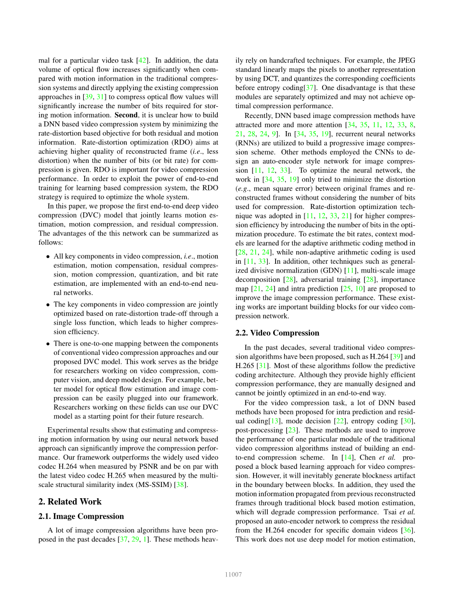 最近,基于DNN的图像压缩方法越来越受关注[34, 35, 11, 12, 33, 8, 21, 28, 24, 9]。在[34, 35, 19]中,循环神经网络 (RNN) 用于构建渐进式图像压缩方案。其他方法使用CNN来设计图像压缩的自动编码器样式网络[11, 12, 13]。为了优化神经网络,[34, 35, 19]中的仅尝试最小化原始帧和重建帧之间的失真(例如均方误差),而不考虑用于压缩的位数。在[11, 12, 33, 21]中采用引入比特数来提高压缩效率。为了估计比特率,在[28, 21, 24]中为自适应算法编码学习上下文模型,而在[11, 33]中使用非自适应算法编码。此外,其他技术如广义除法归一化 (GDN) [11]、多尺度图像分解[28]、对抗训练[28]、重要性图[21, 24]和帧内预测[25, 10]建议提高图像压缩性能,这些现有的技术是我们视频压缩网络的重要组成部分。