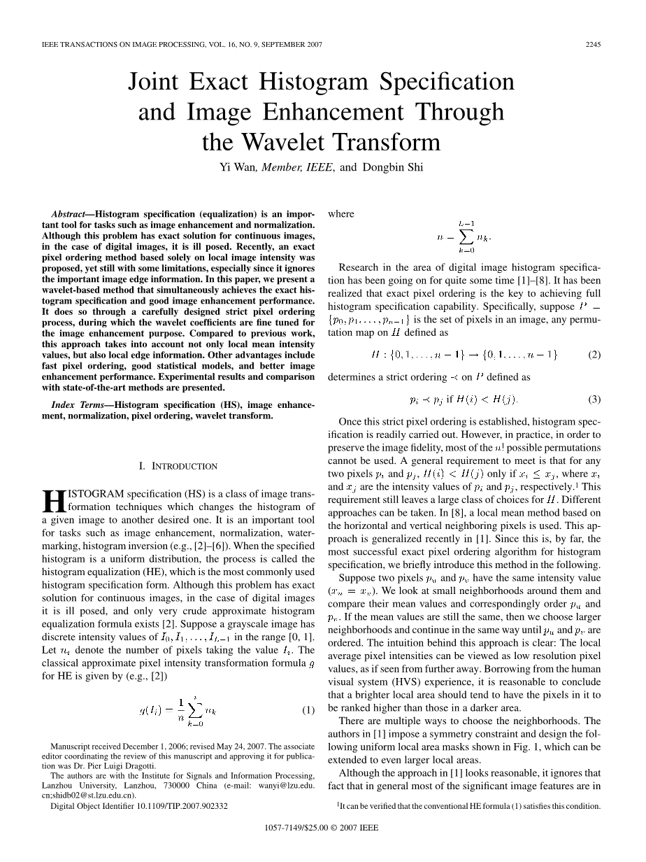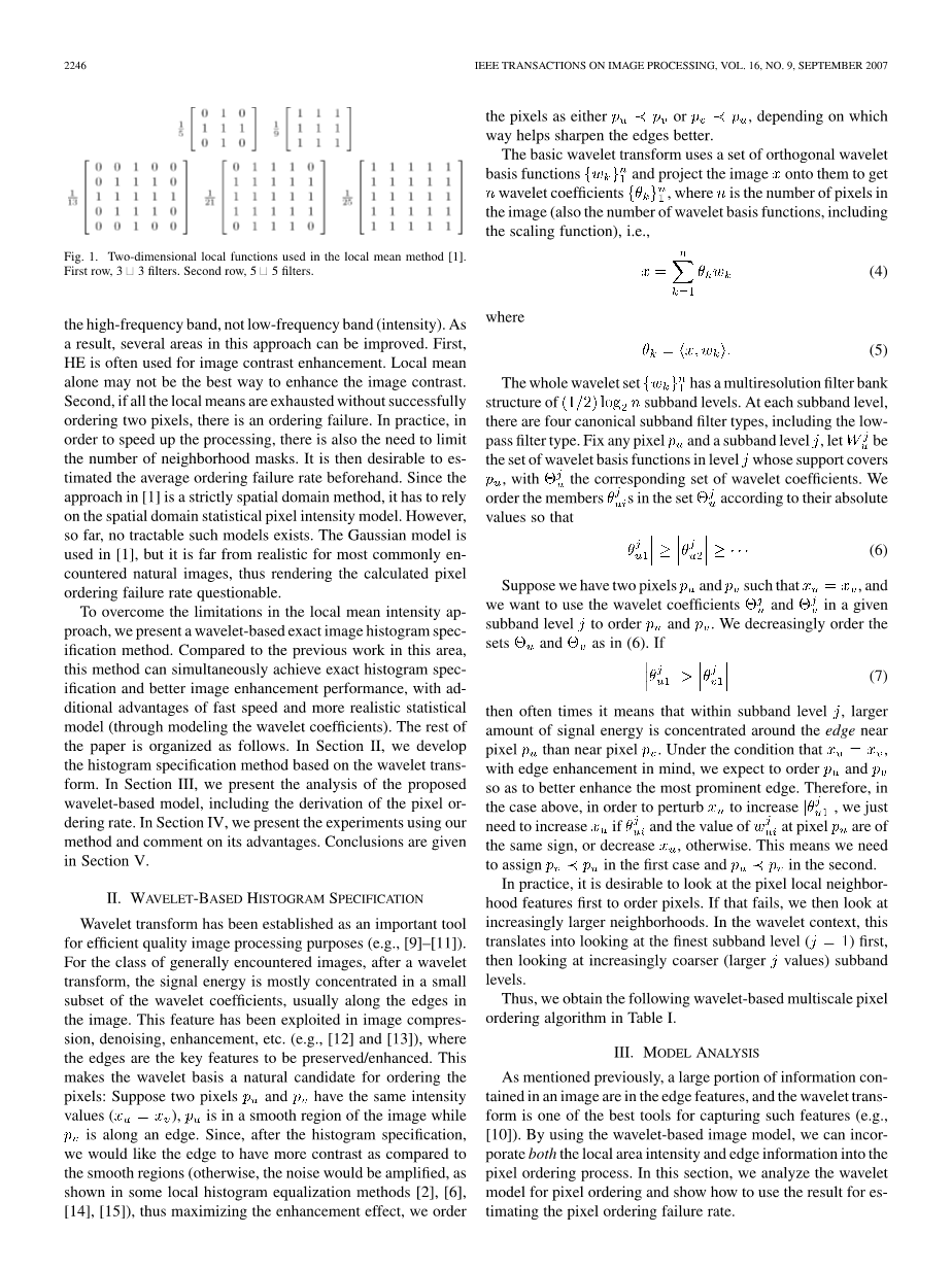 为了克服局部平均强度方法的局限性,我们提出了一种基于小波的精确图像直方图描述方法。与以前的工作相比,该方法可以同时实现精确的直方图描述和更好的图像增强性能,同时具有速度快和更真实的统计模型(通过对小波系数建模)的优点。论文的其余部分组织如下。在第二节中,我们开发了基于小波变换的直方图规格说明方法。在第三节中,我们对提出的基于小波的模型进行了分析,包括像素排序率的推导。在第四节中,我们介绍了使用我们的方法进行的实验,并对其优点进行了评述。结论见第五节。