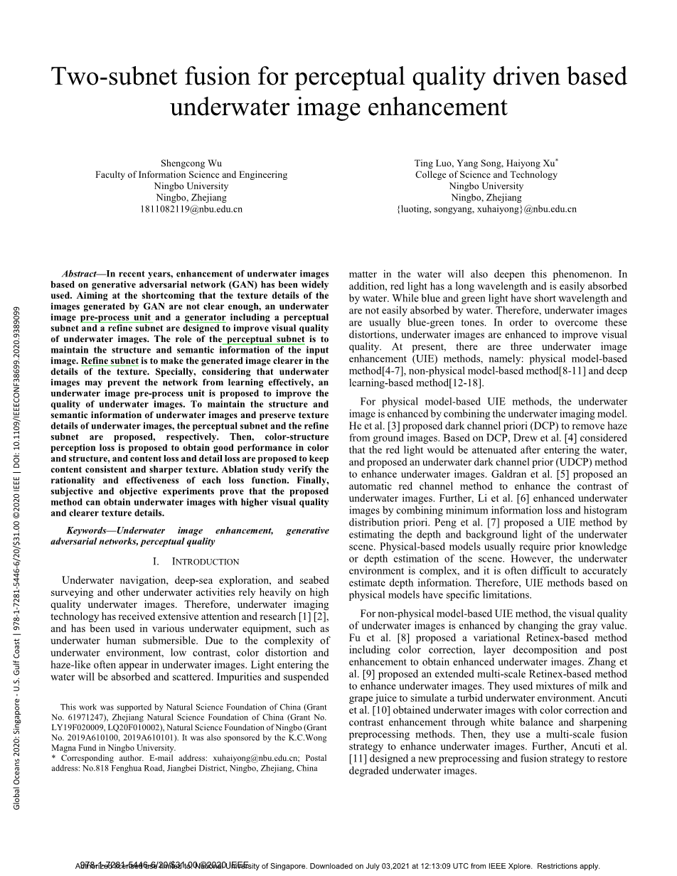 基于感知质量驱动的为了水下图像增强的双子网融合