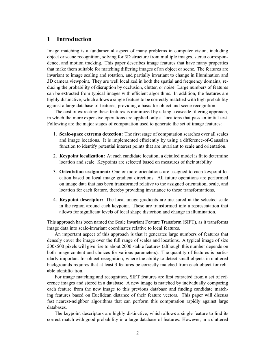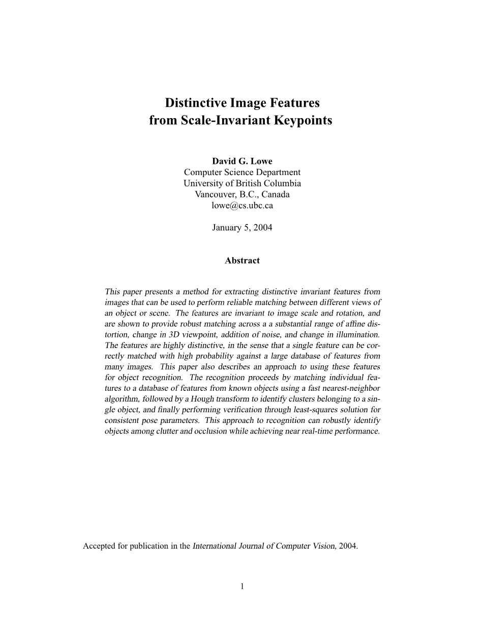 图像匹配是计算机视觉中许多问题的一个基本方面,包括目标或场景识别、从多幅图像中求解三维结构、立体关联和运动跟踪等。本文描述了具有许多特性的图像特征,这些特性使它们适合于匹配对象或场景的不同图像。该特征对图像的缩放和旋转不变,对光照和3D摄像机视点的变化部分不变。它们在空间域和频率域都有很好的局域性,再现了被遮挡、杂波或噪声破坏的概率。通过有效的算法可以从典型图像中提取大量的特征。另外,特征值具有很强的独特性,使得单个特征能够与大量的特征数据库进行高概率的匹配,为目标和场景识别提供了基础。