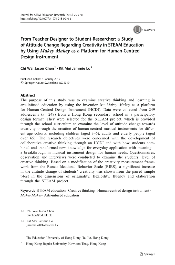 [2] 外文原文所在书名或论文题目:From Teacher-Designer to Student-Researcher: a Study of Attitude Change Regarding Creativity in STEAM Education by Using MakeyMakey as a Platform for Human-Centred Design Instrument