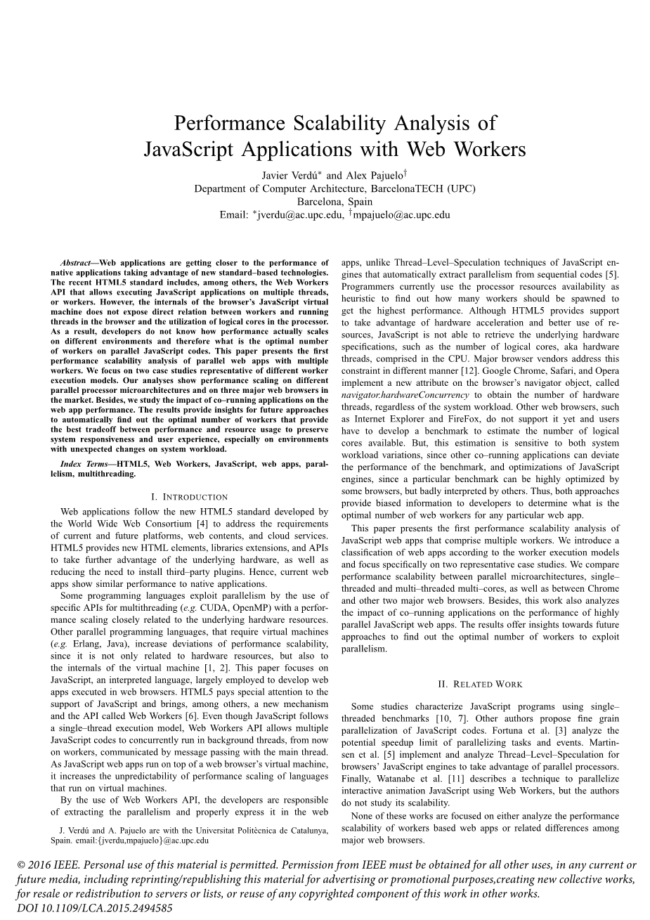 一些研究使用单线程基准来描述JavaScript程序。其他作者提出了JavaScript代码的细粒度并行化。弗图纳等人 [3] 分析并行任务和事件的潜在加速极限。马丁森等人实现并分析浏览器的JavaScript引擎的线程-级别-推测以利用并行处理器。最后,Watanabe等人描述了一种使用WebWorker并行化交互式动画JavaScript的技术,但作者没有研究其可扩展性。