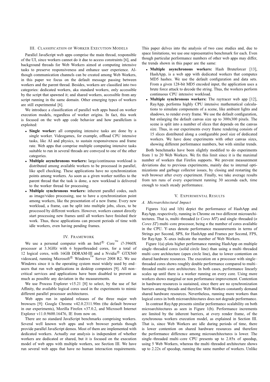 没有由Web Workers组成的标准JavaScript基准。几个著名的Web应用和Web浏览器门户提供了并行的JavaScript演示。其中大部分都是由出色的Web Workers实施的。实际上,我们的分析与Web Workers是专职还是共享无关,但它集中在具有多个Web Workers的Web应用程序的执行模型上,参见第三部分。我们已经运行了几个没有人工交互要求的Web应用程序。