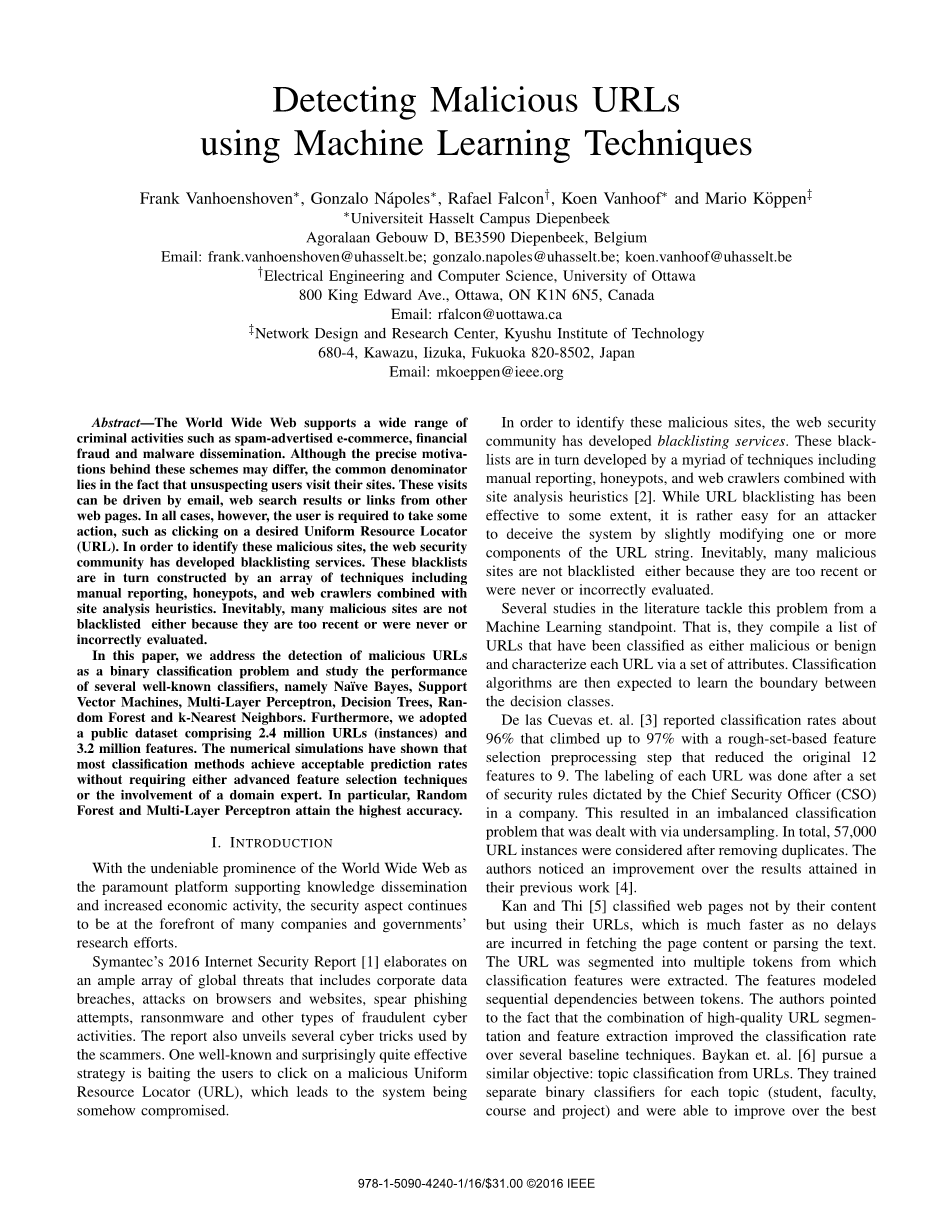 本文我们将恶意URL的检测问题看作一个二分类问题,并研究了几个著名的分类器的性能,即NaIuml;ve Bayes、支持向量机、多层感知器、决策树、随机森林和k近邻。此外,我们采用了一个包含240万个URL (实例)和320万个特征的公共数据集。数值模拟表明,大多数分类方法在不需要先进的特征选择技术或领域专家参与的情况下达到了可接受的预测率。特别是随机森林和多层感知器达到了最高的精度。