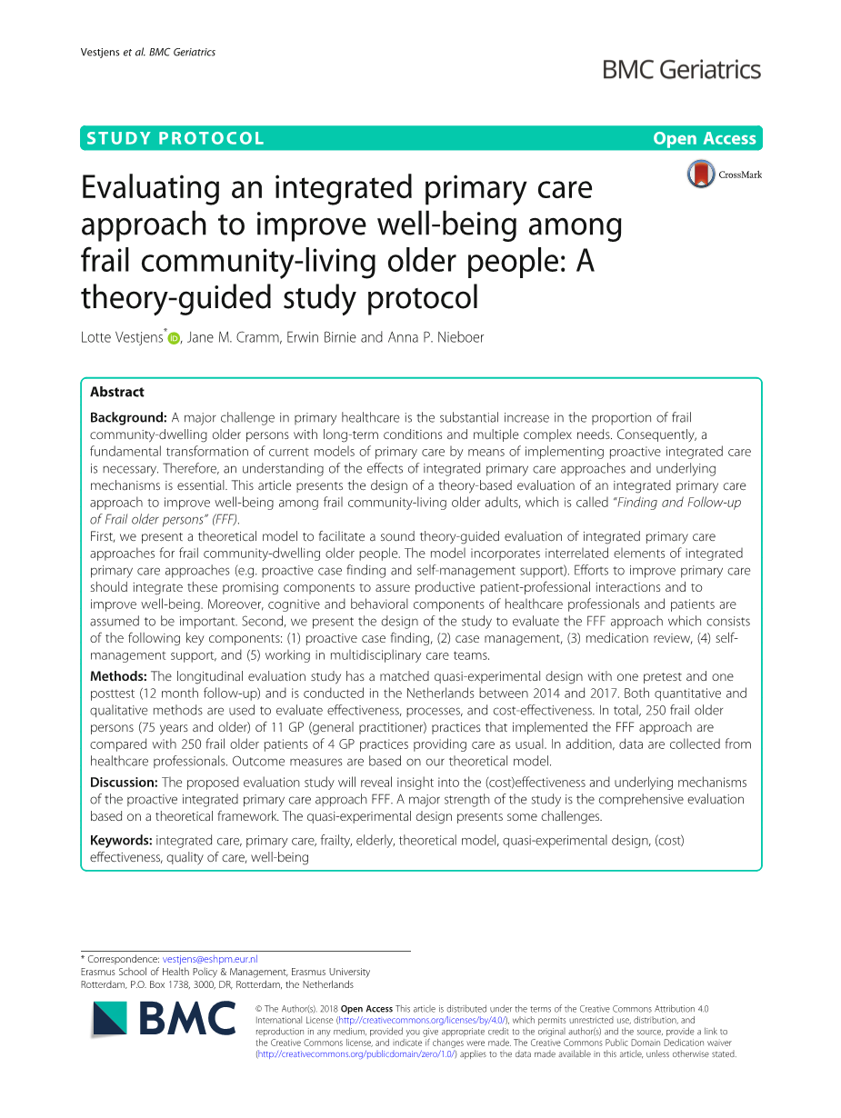 摘要:初级卫生保健领域的一个主要挑战是,患有长期疾病和多种复杂需求的社区体弱老年人的比例大幅增加。因此,有必要通过实施积极的综合护理,从根本上改变目前的初级保健模式。因此,了解综合初级保健方法的效果和基本机制至关重要。这篇文章提出了一个基于理论的综合初级保健方法评估的设计,该方法被称为“发现和跟踪脆弱的老年人”(FFF),旨在改善社区生活中脆弱的老年人的福祉。首先,我们提出了一个理论模型,以促进对脆弱社区老年人综合初级保健方法进行合理的理论指导评估。该模型包含综合初级保健方法的相关要素(例如,主动病例发现和自我管理支持)。改善初级保健的努力应整合这些有希望的组成部分,以确保有效的患者专业互动和改善福祉。此外,医疗专业人员和患者的认知和行为成分被认为是重要的。第二,我们提出了研究设计,以评估FFF方法,该方法包括以下关键组成部分:(1)前瞻性病例发现,(2)病例管理,(3)药物评估,(4)自我管理支持,(5)在多学科护理团队中工作。方法2014年至2017年在荷兰进行的纵向评估研究采用了一个匹配的准实验设计,包括一个前测和一个后测(12个月随访)。使用定量和定性方法评估有效性、过程和成本效益。总共,对实施FFF方法的11家GP(全科医生)诊所中的250名体弱老年人(75岁及以上)与4家GP诊所中的250名体弱老年患者(照常提供护理)进行了比较。此外,数据收集自医疗专业人员。结果测量基于我们的理论模型。讨论建议的评估研究将揭示前瞻性综合初级保健方法FFF的(成本)效益和潜在机制。这项研究的一个主要优势是基于理论框架的综合评价。准实验设计提出了一些挑战。
