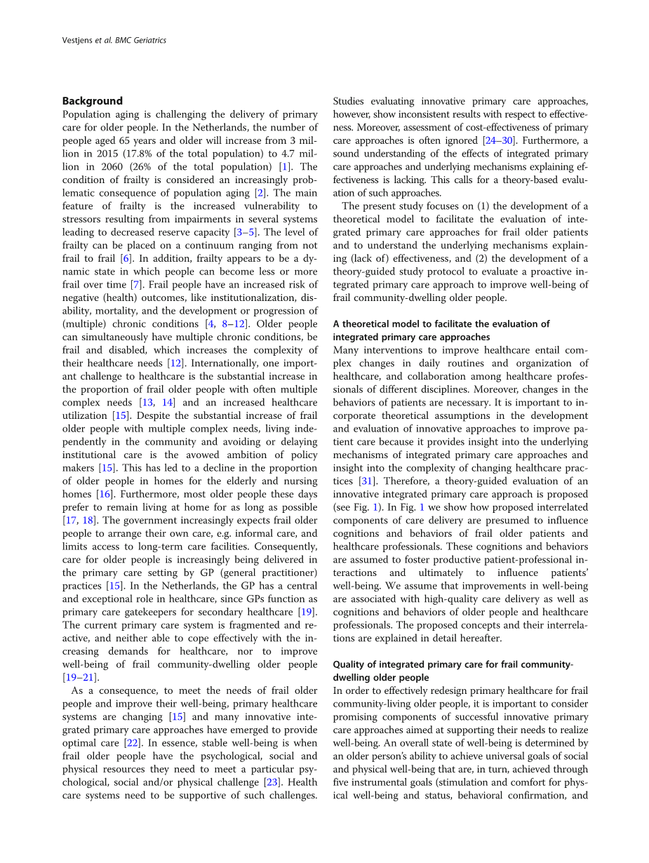 人口老龄化正在挑战为老年人提供初级保健。在荷兰,65 岁及以上的人口数量将从 2015 年的 300 万(占总人口的 17.8%)增加到 2060 年的 470 万(占总人口的 26%)[ 1 ]。身体虚弱被认为是人口老龄化带来的越来越成问题的后果 [ 2 ]。虚弱的主要特征是由于几个系统的损伤导致储备能力下降而导致对压力源的脆弱性增加 [ 3 , 4 , 5 ]。虚弱的程度可以放在从不虚弱到虚弱的连续统一体上 [ 6]]。此外,虚弱似乎是一种动态状态,随着时间的推移,人们会变得越来越虚弱 [ 7 ]。身体虚弱的人具有的负(健康)的结果的风险增加,像制度化,残疾,死亡率,且(多个)慢性疾病[发展或进展4,8,9,10,11,12 ]。老年人可能同时患有多种慢性病,身体虚弱和残疾,这增加了他们医疗保健需求的复杂性 [ 12 ]。在国际上,医疗保健面临的一项重要挑战是,通常有多种复杂需求的虚弱老年人的比例大幅增加。13 , 14 ] 和增加的医疗保健利用率 [ 剩余内容已隐藏,支付完成后下载完整资料