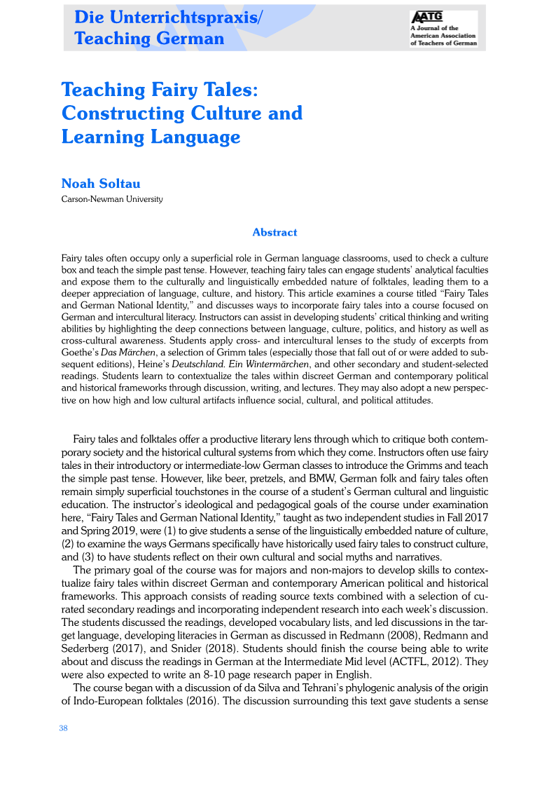 童话和民间故事提供了一个富有成效的文学镜头,通过它来批判当代社会和它们所来自的历史文化体系。教师经常在他们的入门或中低德语课程中使用童话故事来介绍格林并教授简单的过去时。然而,就像啤酒、椒盐卷饼和宝马一样,德国民间故事和童话故事在学生的德国文化和语言教育过程中往往只是表面上的试金石。在 2017 年秋季和 2019 年春季作为两项独立研究教授的课程“童话故事和德国民族认同”在此处检查的教师的思想和教学目标是让学生了解文化的语言嵌入本质,