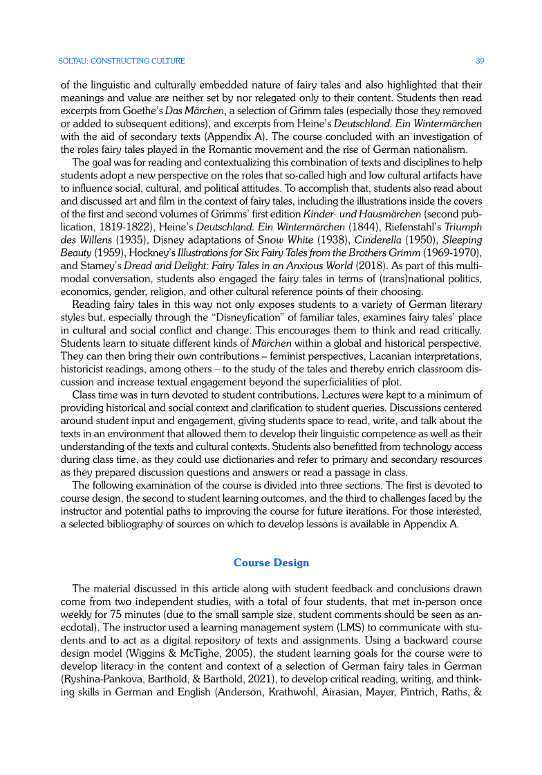 本课程的主要目标是让专业和非专业的学生在谨慎的德国和当代美国政治和历史框架内培养将童话故事背景化的技能。这种方法包括阅读源文本,结合精选的二级阅读材料,并将独立研究纳入每周的讨论。学生们讨论了阅读材料,制定了词汇表,并用目标语言领导了讨论,发展了德语的读写能力,正如 Redmann ( 2008 )、Redmann and Sederberg ( 2017 ) 和 Snider ( 2018 ) 所讨论的那样。学生应完成课程,能够在中级水平(ACTFL,2012)。他们还被要求用英文写一篇 8-10 页的研究论文。
