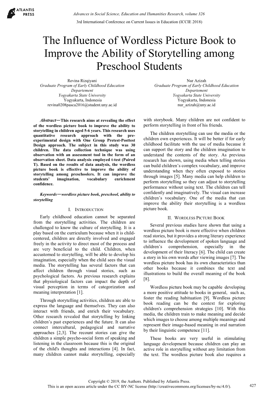 [1]Revina Rizqiyani,Nur Azizah. The Influence of Wordless Picture Book to Improve the Ability of Storytelling among Preschool Students[P]. 3rd International Conference on Current Issues in Education (ICCIE 2018),2019.