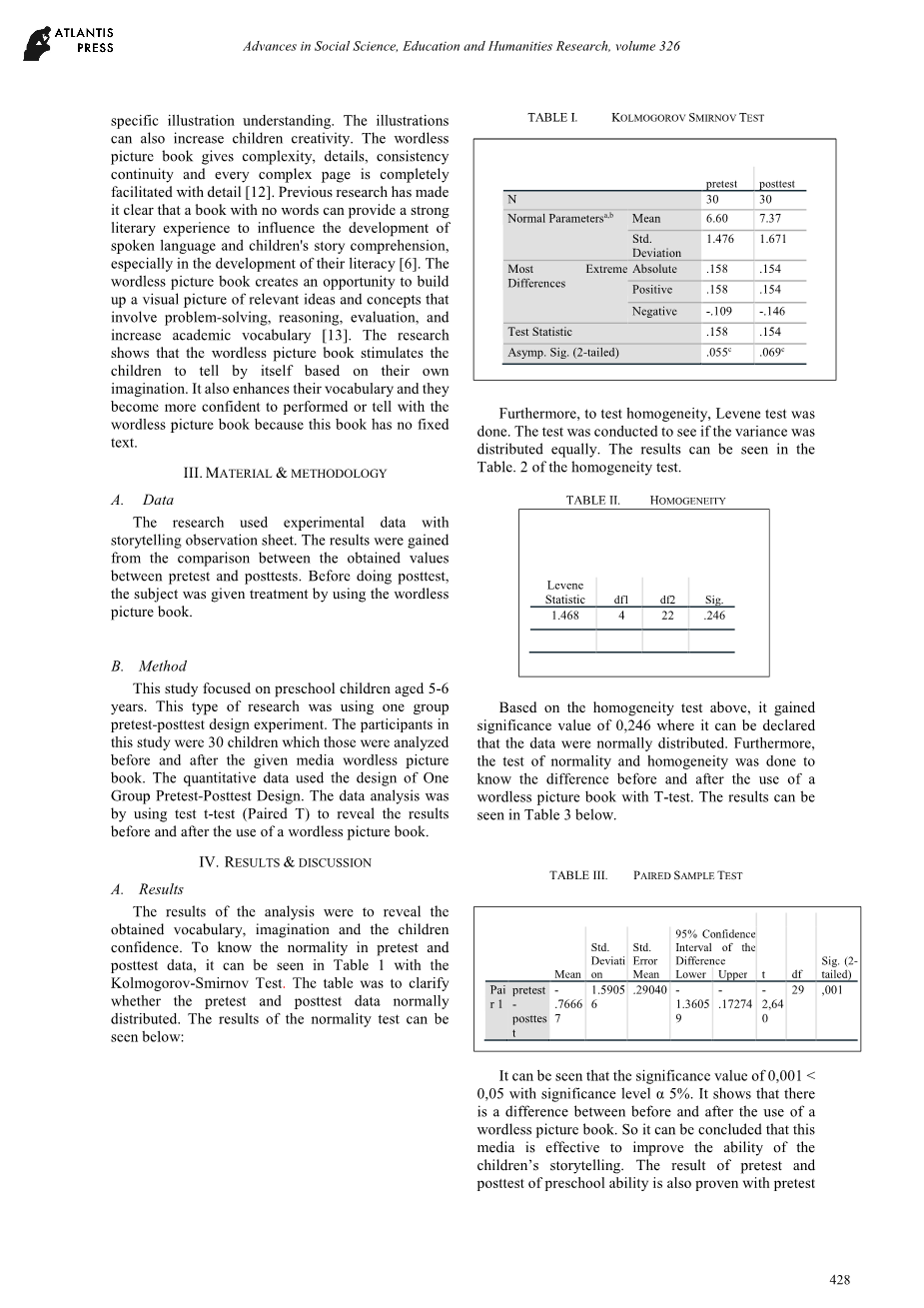 研究主要研究对象是5-6岁的学龄前儿童。这类研究采用一种前-后测试的实验方法。参与实验的30名孩子,在阅读完无声绘本之前和之后被分析。定量数据采用一组前-后测试设计。数据分析采用配对样本t检验来显示使用无文字绘本前后的结果。