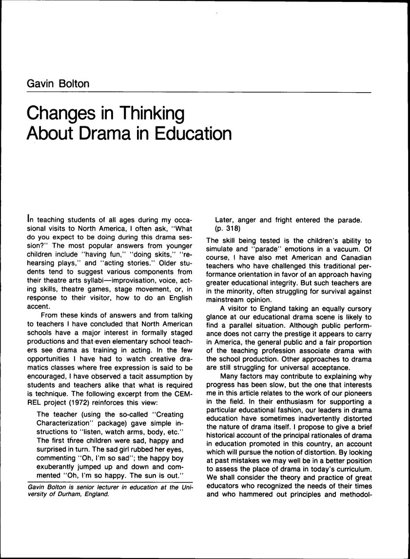 到英国的访客只要粗略地看一眼我们的教育戏剧场景,就可能会发现类似的情况。虽然公众表演在美国并没有声望,但一般公众和相当比例的教学专业将戏剧与学校制作联系在一一起。其他处理戏剧的方法仍在努力获得普遍接受。