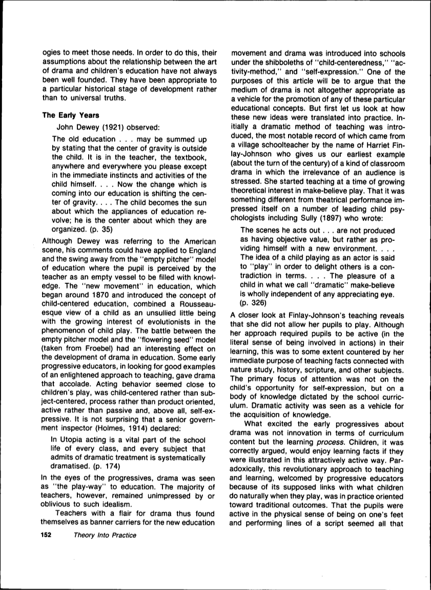 有戏剧天赋的老师就这样被发现了,在“以儿童为中心”、“活动方式”和“自我表达”的陈词滥调中,他们作为新教育运动和戏剧的旗帜载体被引入学校。本文的目的是论证戏剧媒介并不完全适合作为宣传这些特定内容的工具。但首先,让我们看看这些新思想是如何被转化为实践的。最初,一种戏剧化的教学方法问世,其中最著名的是一位名叫哈里特·芬雷·约翰逊的乡村教师,他给了我们最早的例子(关于世纪之交):一种在教室的、与观众无关的戏剧。哈里特强调她在一个成长的时期开始教书,对虚构游戏的理论感兴趣。的确如此,与戏剧表演不同的是,许多著名的儿童心理医生,包括Sully(1897年),都曾写道: