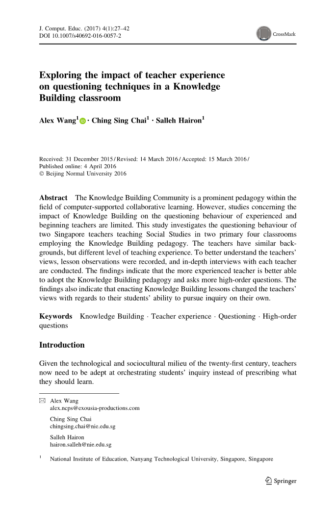 知识建设社区是一个重要的教学法。计算机支持的协作学习领域。然而,有关研究知识建设对有经验和有经验的人提问行为的影响初级教师有限。本研究调查了学生的提问行为两名新加坡教师在两个小学四年级教室教授社会研究采用知识构建教学法。教师背景相似,但教学经验水平不同。为了更好地了解老师观点,课堂观察记录,并与每位教师进行深度访谈进行。研究结果表明,经验越丰富的教师能力越好采用知识构建教学法并提出更多高阶问题。这调查结果还表明,制定知识建设课程改变了教师的对学生自主探究能力的看法。