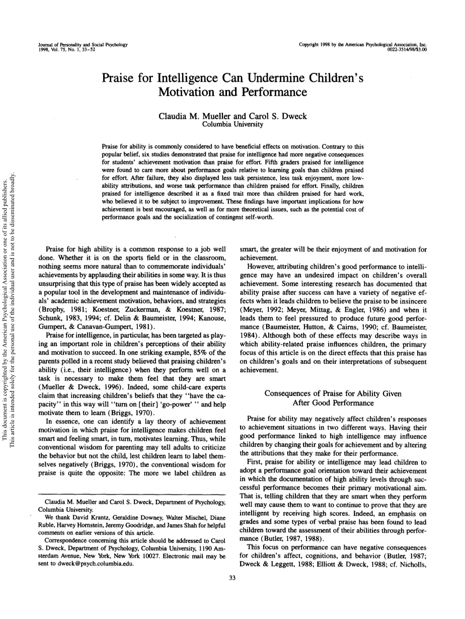 尤其是对智力的表扬,在孩子们对自己成功的能力和动机的认知中起着重要的作用。一个突出的例子是,在最近的一项研究中,859%的受访父母认为,当孩子在一项任务中表现出色时,表扬他们的能力(即他们的智力)是必要的,这样可以让他们觉得自己很聪明(Mueller amp; Dweck,1996)。事实上,一些儿童护理专家声称,通过这种方式增加儿童“有能力”的信念将“开启[他们的]lsquo;行动力rsquo;”,并有助于激励他们学习(Briggs,1970)。