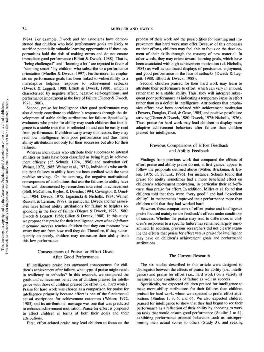 而将成功归因于内在能力或特质的个体被归类为成就效能感高(参见Schunk,1994,1996)和动机高(参见Weiner,1972,1985;Weiner et al .,1971),那些把失败归因于能力的人并没有得到同样积极的努力。相反,对成就感兴趣的研究人员已经很好地记录了将失败归因于能力的归因的负面动机后果(Bell,McCallum,Bryles,amp; Driesler,1994;Covington amp; Omel- ich,1984年;德韦克,1975年;贾加辛斯基和尼科尔斯,1984年;韦纳、拉塞尔和勒曼,1979年)。特别是,德韦克和她的同事将失败的能力归因于面对失败时的无助反应(Diener amp;德韦克,1978,1980;德韦克amp;莱格特,1988;埃利奥特amp;德韦克,1988年)。在这项研究中,我们认为,即使是在真正的成功之后,对孩子智力的赞美也能教会孩子,他们可以从自己的表现来衡量自己有多聪明。因此,如果他们随后表现不佳,孩子们可能会从这种低表现中重新衡量自己的能力。
