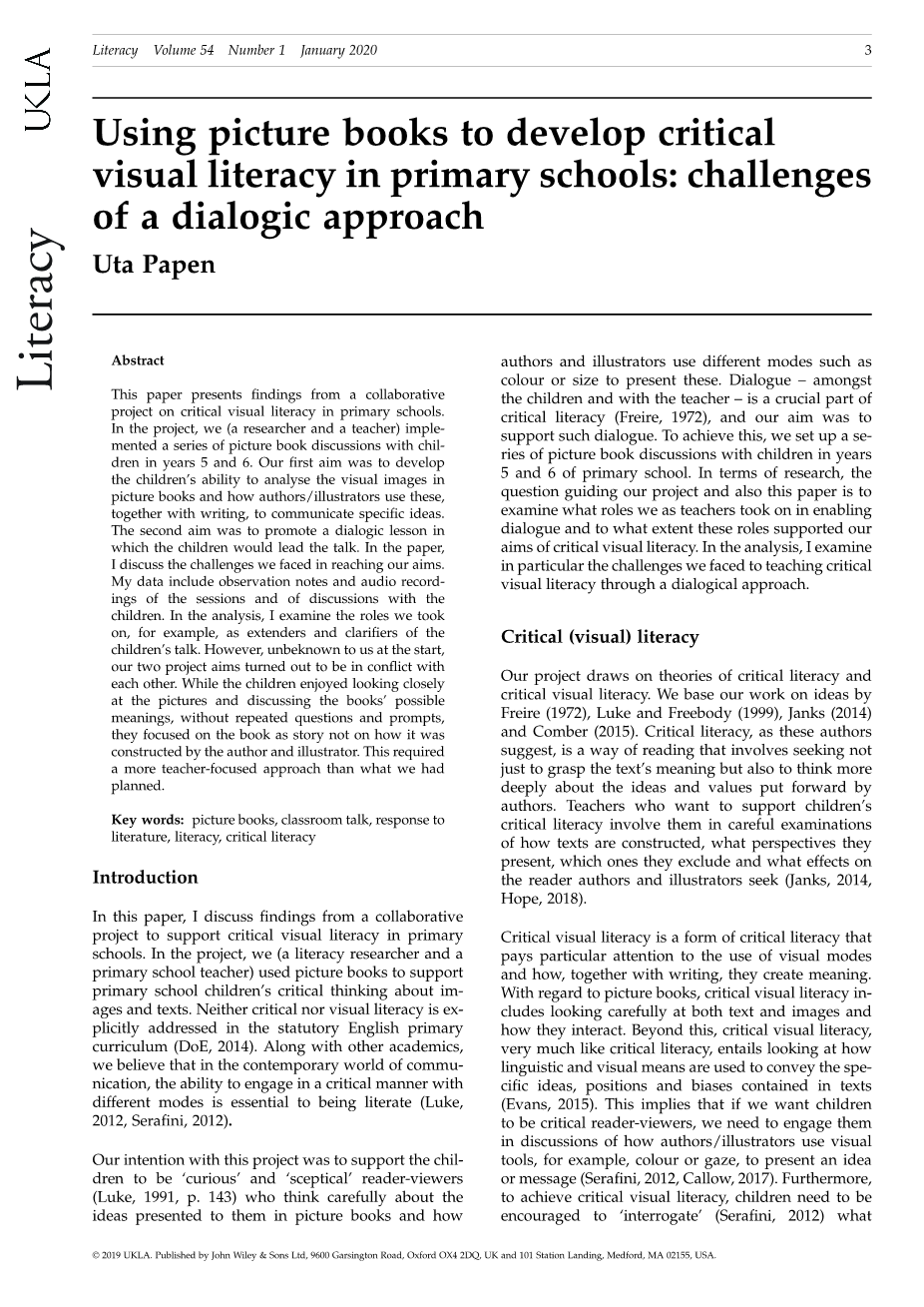 在本文中,研究者讨论了一个支持小学视觉性批判读写能力读写能力发展的合作项目结果。在该项目中,研究者们(一名有学识的研究员和一名小学教师)使用图画书来发展小学生对图像和文本的批判性思维。法定的英语初级课程(DoE,2014)中既没有明确提及批判性读写能力也没有提及视觉性批判素养。与其他学者一样,研究者相信在当今的交流世界中,以批判的方式和以不同的方式去参与的能力对于识字来说是至关重要的(Luke,2012,Serafini,2012)。这个项目的意图是帮助孩子们成为“好奇的”与“怀疑的”的读者(Luke,1991,第143页),帮助他们仔细思考图画书中呈现给他们的想法,以及作者和插画家如何使用不同的模式(如颜色或大小)来呈现这些想法的。孩子间的对话以及老师与孩子间的对话是批判性读写能力的重要组成部分(Freire,1972),同时,本研究的目标是帮助这种对话的建立与维持。为此,研究者与小学5年级和6年级的孩子进行了一系列绘本讨论。在研究方面,教师在促进对话中所扮演的角色是本研究检验的核心问题,以及这些角色在多大程度上支撑了我们视觉性批判读写能力目标的实现。在分析中,研究者特别研究了通过对话方法发展视觉性批判读写能力所面临的挑战。