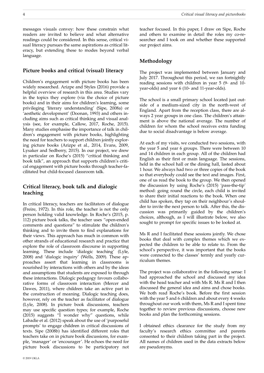 在批判性读写能力的培养过程中,教师是对话的促进者(Freire,1972)。在这个角色中,教师并不是唯一持有有效知识的人。在罗氏(2015,p.112)的绘本演讲中,老师使用“开放式评论和问题”来激发孩子们的思维,鼓励他们去为自己的观点进行辩论。这种方法与有关探索课堂话语在支持学习中的作用的其他教育研究论文和实践论文中的方法有很多共同之处。其中包括“对话教学”(Lyle,2008)和“对话探究”(Wells,2009)。这些方法断言,课堂中学习的进行是在教师与其他学生的交流产生的观点以及观点所引申出的假设中得以发展的。对话教学法更偏向于需要儿童积极参与的课堂互动式的教学环境(Mercer和Dawes,2011年)。然而,对话式教学确实依赖于教师作为对话促进者的这个角色(Lyle,2008)。在绘本讨论中,教师可以使用特定的问题类型,例如,Roche(2015)倾向于使用“我想知道为什么”句式的问题,而Labadie等人(2012)倾向于使用“有目的的提示”让儿童参与到对文本的批判性讨论中。Sipe(2008b)已经确定了教师在绘本讨论中扮演的不同角色,例如“管理者”或“鼓励者”。他倾向于教师在绘本讨论中是参与性的而不是教师中心性的。在这篇论文中,我借鉴了Sipe、Roche和其他研究者的讲演,详细研究了本研究中研究者所扮演的角色,以及这些角色是否支持我们的项目目标。