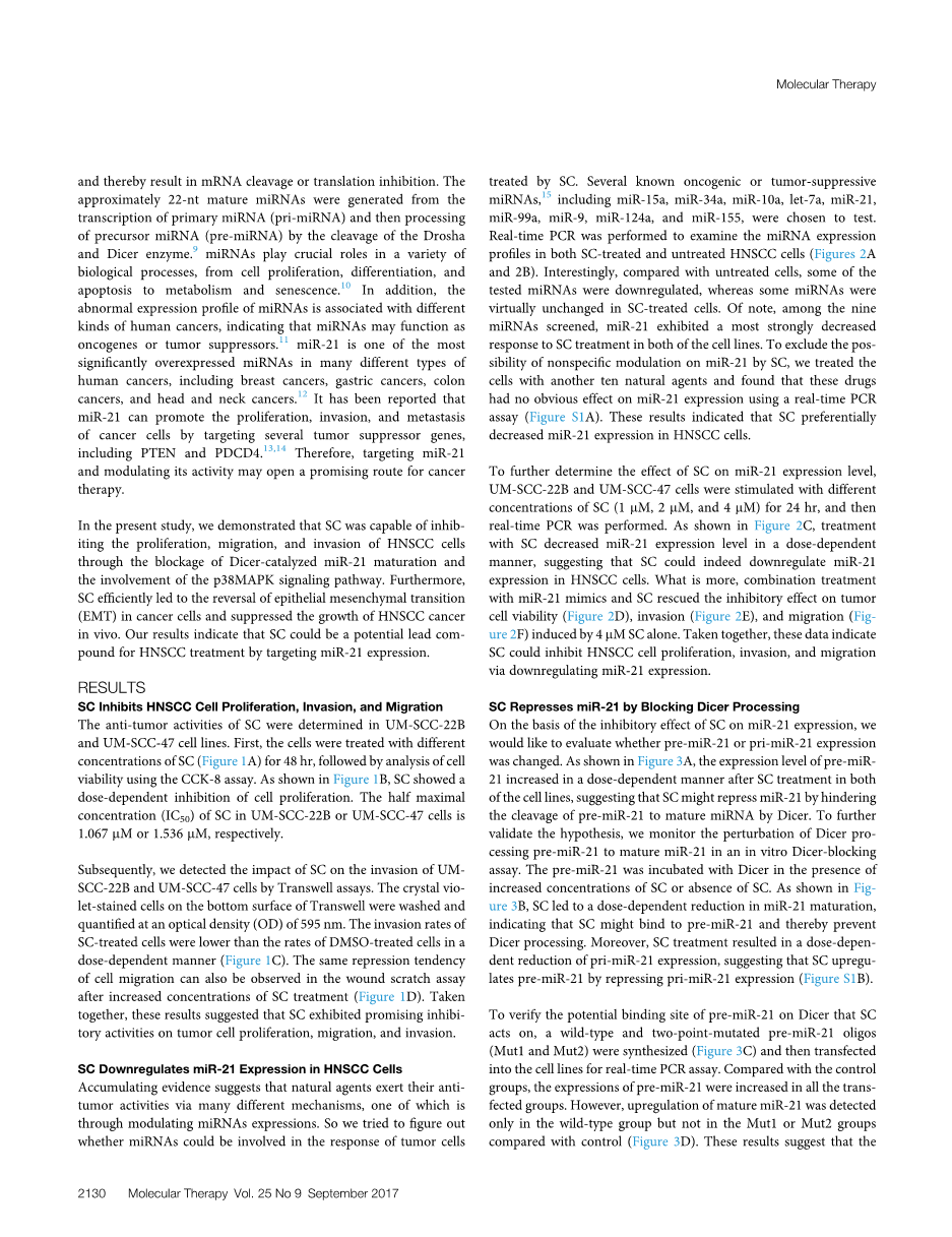 在本研究中,我们证明SC能够通过阻断Dicer催化的miR-21成熟和参与 p38MAPK 信号通路来抑制HNSCC细胞的增殖、迁移和侵袭。此外,S有效地促使癌细胞中上皮间充质转化(EMT)的逆转并抑制体内HNSCC的生长。我们的结果表明,SC 可能是通过靶向 miR-21 表达来治疗 HNSCC 的潜在先导化合物。