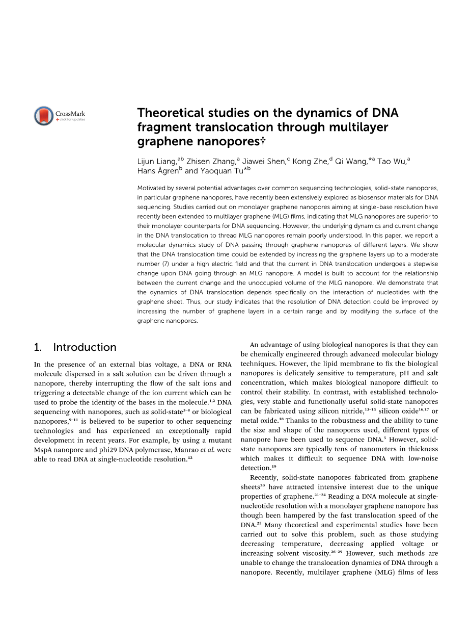 摘要:固体纳米孔,特别是石墨烯纳米孔,由于与普通测序技术相比具有几个潜在的优点,最近作为 DNA 测序的生物传感器材料得到了广泛的探索。针对单碱基分辨率的单层石墨烯纳米孔的研究最近已经扩展到多层石墨烯 (MLG) 薄膜,表明 MLG 纳米孔在 DNA 测序方面优于单层石墨烯纳米孔。然而,DNA 易位到 MLG 纳米孔的潜在动力学和电流变化仍然知之甚少。本文报道了 DNA 通过不同层次石墨烯纳米孔的分子动力学研究。结果表明,在强电场作用下,增加石墨烯的层数(7层)可以延长 DNA 的移位时间,并且 DNA 通过 MLG 纳米孔后,DNA 移位的电流会发生逐步变化。建立了电流变化与 MLG 纳米孔未占用体积之间的关系模型。我们证明 DNA 移位的动力学特别依赖于核苷酸与石墨烯的相互作用。因此,我们的研究表明,在一定范围内增加石墨烯层数,并对石墨烯纳米孔进行表面修饰,可以提高 DNA 检测的分辨率。