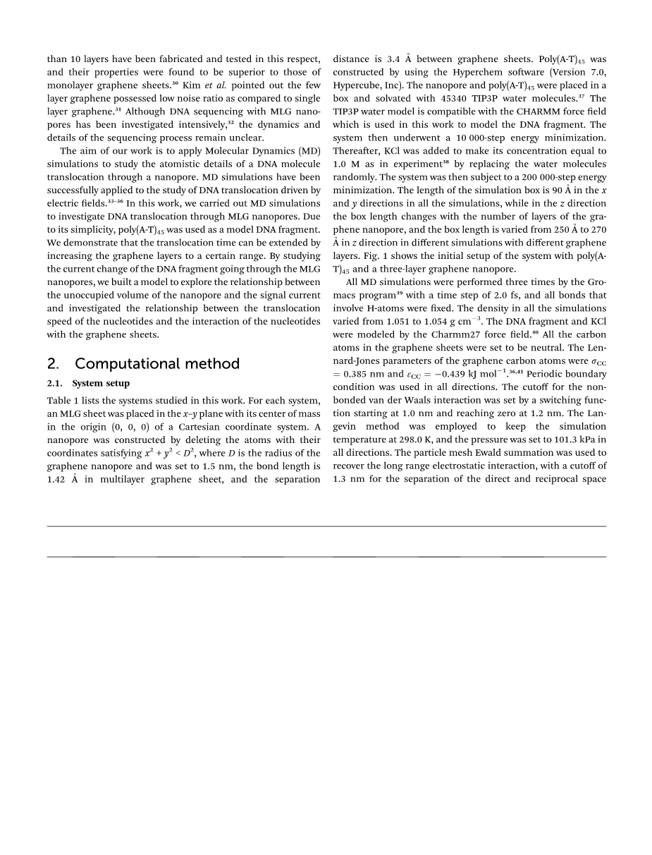 表 1列出了在这项工作中研究的系统。对于每个系统,一个 MLG 片放置在 x - y 平面上,其质量中心位于笛卡儿坐标系的原点(0,0,0)。通过删除坐标为 x2 y2 lt; d2 的原子构建了一个纳米孔,其中D为石墨烯纳米孔的半径,设定为 1.5 nm,多层石墨烯片中的键长为 1.42 Aring; ,并分离石墨烯片之间的距离是 3.4 Aring; 。通过使用 Hyperchem 软件(版本7.0, Hypercube,Inc )构建 poly(A-T)45 将纳米孔和 poly(A-T)45 放在一个盒子里,用 45340 TIP3P 水分子溶剂化[37]。 TIP3P 水模型与本研究用来模拟 DNA 片段的 CHARMM 力场是相容的。然后系统经历了10000步的能量最小化。此后,通过随机替换水分子,添加 KCl 使其浓度等于实验[38]中的1.0 M。然后,该系统受到20万步能量的影响最小化。在所有的模拟中,模拟盒的长度在 x 和 y 方向上均为 90 Aring; ,而在 z 方向上,模拟盒的长度随梯度层数的增加而变化,在不同石墨烯层的不同模拟中,模拟盒的长度在 z 方向上从250 Aring; 到270 Aring; 不等。图 1显示了 poly(A-T)45 和三层石墨烯纳米孔的系统的初始设置。