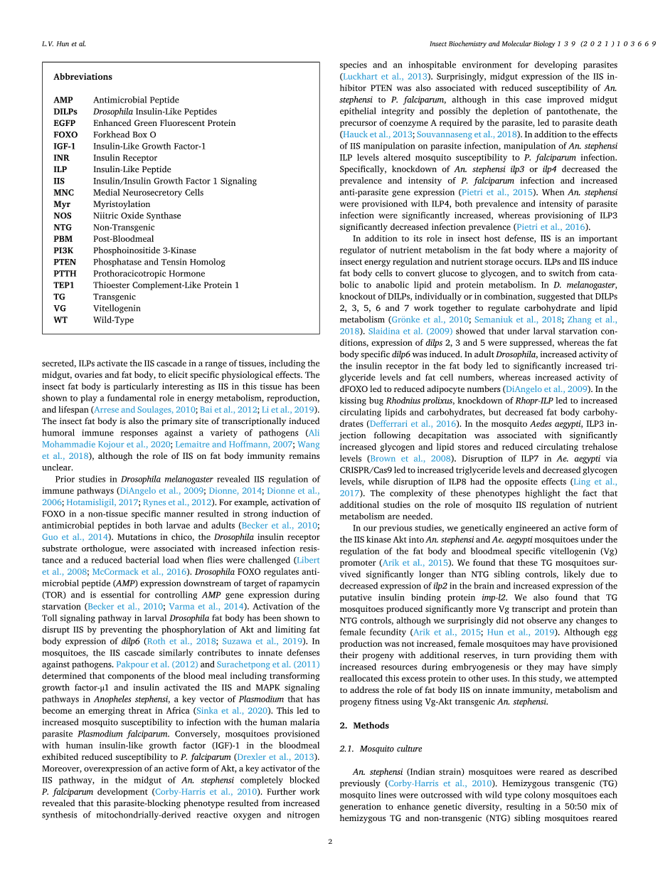 疟疾仍然是世界范围内的一个主要问题,每年估计有2 . 29亿个病例,超过400,000人死亡(世界卫生组织,2020)。虽然长效驱虫蚊帐的广泛分发改善了这一状况,但除非能够找到新的控制战略,否则药物和杀虫剂耐药性的增加很可能会限制这些成果。胰岛素/胰岛素生长因子1信号传导(IIS)级联作为对载体能力至关重要的多种生理学的中央调节器,包括先天免疫、生殖、生长、代谢和寿命(Ahlers等人,2019;安东诺娃等人,2012年;Hun等,2019;凌等,2017;凌和赖克赫尔,2021;Sharma等人,2019)。因此,IIS是减少蚊虫媒介中寄生虫感染和限制寄生虫传播的有吸引力的目标。IIS以组织特异性的方式发挥作用,根据每个组织的要求控制细胞代谢(安东诺娃等人,2012;李等,2020;Nandi等人,2004年;萨尔蒂尔和卡恩,2001年)。在昆虫中,胰岛素样肽(ILPs)主要表达在位于头部大脑中间部的中间神经分泌细胞(MNCs)中。然而,ILPs的表达也在多种其他昆虫组织中得到表征,包括中肠、卵巢、神经胶质细胞、脂肪体和成虫盘(Das和Arur,2017;林和斯马格,2019;马尔克斯等人,2011;Nauml; ssel等人,2013年;Riehle等人,2006年)。当分泌时,ILPs激活一系列组织中的IIS级联,包括中肠、卵巢和脂肪体,以引发特定的生理效应。昆虫脂肪体特别有趣,因为该组织中的IIS已被证明在能量代谢、繁殖和寿命中起着重要作用(Arrese和Soulages,2010;白等,2012;李等,2019)。昆虫脂肪体也是针对多种病原体的转录诱导的体液免疫反应的主要位点(Ali Mohammadie Kojour等人,2020;勒迈特和霍夫曼,2007年;王等,2018),虽然IIS对脂肪体免疫的作用尚不明确。