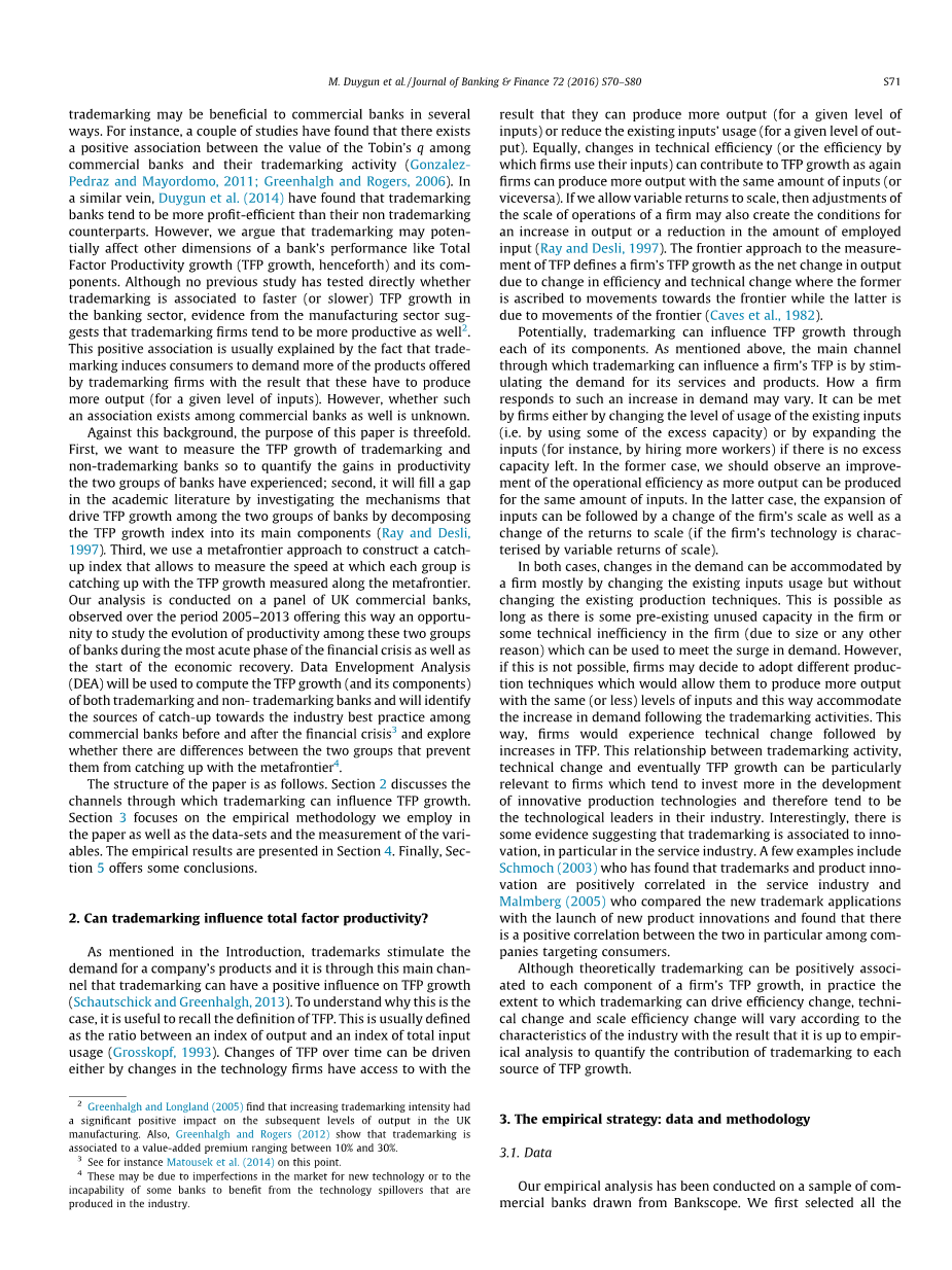 商标对商业银行来说重要吗?换言之,商标对商业银行的经济效益是什么?尽管商标在银行业中被广泛使用,但这些问题在银行业文献中只被部分地探讨过。现有的研究表明商标可能在几个方面对商业银行有利。例如,一些研究发现,商业银行的托宾Q比率值与它们的商标活动之间存在着正相关关系(Gonzalez-Pedraz and Mayordomo, 2011; Greenhalgh and Rogers, 2006)。与此类似,Duygun et al. (2014)发现加商标的银行往往比不加商标的银行更有效益。然而,我们认为商标活动可能会影响银行业绩的其他方面,如全要素生产率的增长及其组成部分。虽然以前的研究没有直接测试过商标是否与银行业的全要素生产率增长较快(或较慢)有关,但来自制造业的证据表明,拥有商标的企业往往也更有生产力。这种正相关关系通常被解释为:贸易标识促使消费者对商标企业提供的产品有更多的需求,结果是这些企业必须生产更多的产出(在一定的投入水平下)。然而,这种关联是否也存在于商业银行中还不得而知。