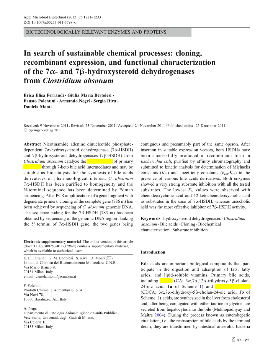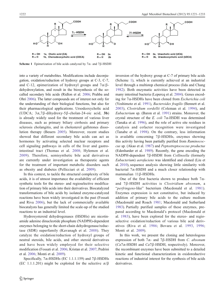 具体地说,7alpha;-HSDHs (EC 1.1.1.159)和7beta;-HSDHs (EC 1.1.1.201)可用于初级胆汁酸C-7位羟基的选择性alpha;/beta;转化(方案1),这是目前在工业水平上通过多步化学过程(Iida和Chang 1982)实现的。在许多肠道细菌中都检测到了这两种酶的活性(Leercq等人。2004年)。目前已经从大肠杆菌(Yoshimoto et al. 1991)、脆弱拟杆菌(Bennett et al.2003)、sordellii梭菌(Coleman et al. 1994)和ubacterium sp. (Baron et al. 1991)菌株中克隆了7alpha;-HSDHs的编码基因。此外,还测定了大肠杆菌7alpha;-HSDH的晶体结构(Tanaka et al.。1996年),并研究了活性位点残基在催化和辅助因子识别中的作用(Tanabe等人)。1998年)。相反,关于7beta;-HSDHs的信息较少,显示这种活性的酶已经从瘤胃球菌中(Akao et al.。1987)和消化性链球菌产品中纯化(Edenhard et al.。(1989年)得到部分纯化。最近,从Collinsella(原真细菌)Aerofaciens中鉴定并克隆了依赖于NADPH的7beta;-HSDH基因(Liu etal. 2010),序列分析表明,该基因与细菌7alpha;-HSDH的相似性较低,而与哺乳动物的11beta;-HSDH有较近的亲缘关系。