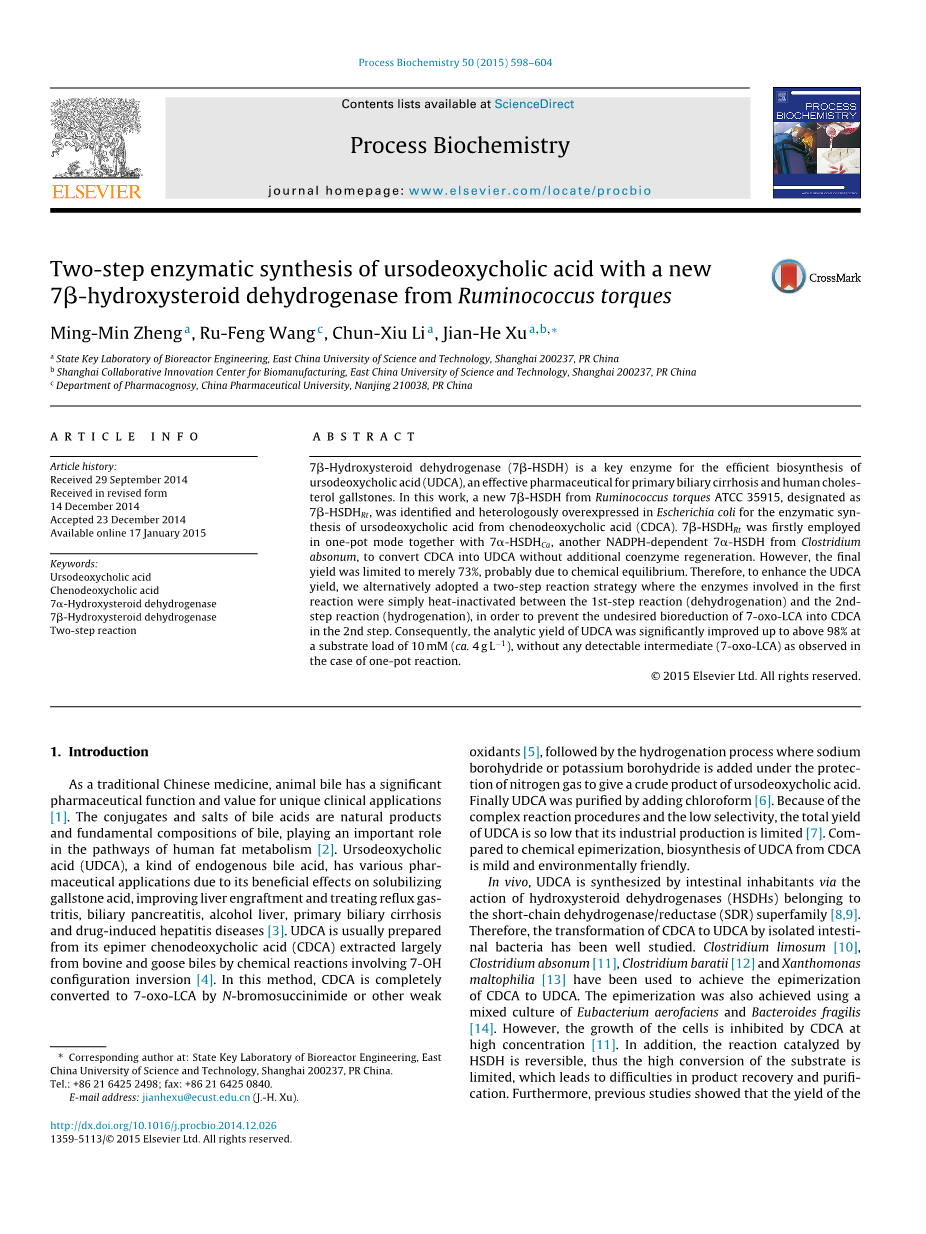 扭链瘤胃球菌中的一种新型7beta;-羟基类固醇脱氢酶用两步酶法合成熊去氧胆酸