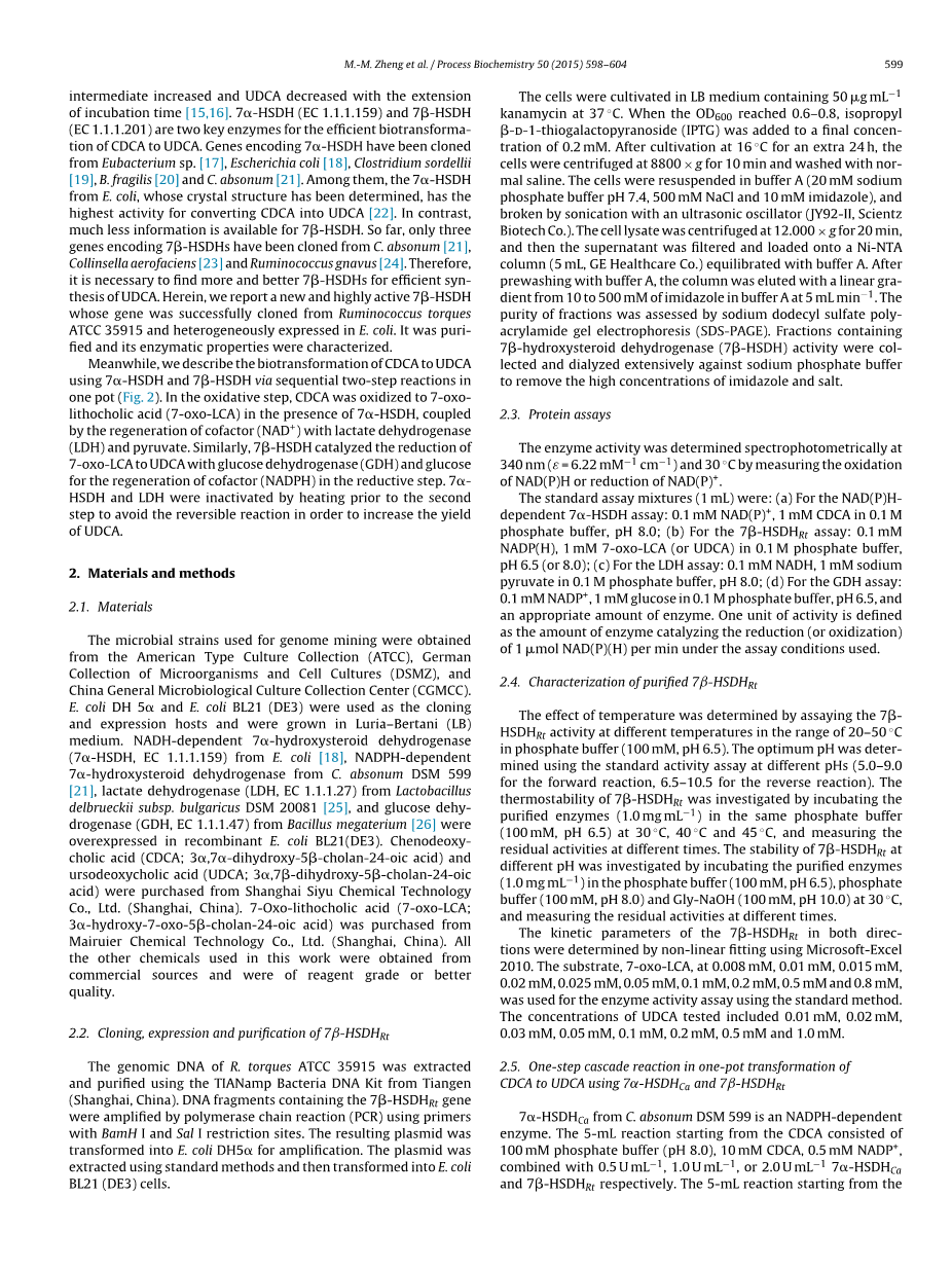 扭链瘤胃球菌(Ruminococcus torques)ATCC 35915的基因组DNA用来自天根(中国上海)的TIANamp细菌DNA试剂盒来提取和纯化。用带有BamHⅠ和SalⅠ酶切位点的引物,聚合酶链反应(PCR)扩增含有7beta;-HSDHRt基因的DNA片段。将得到的质粒转入大肠杆菌DH5alpha;用于放大。用标准方法提取质粒,转入大肠杆菌BL21(DE3)。
