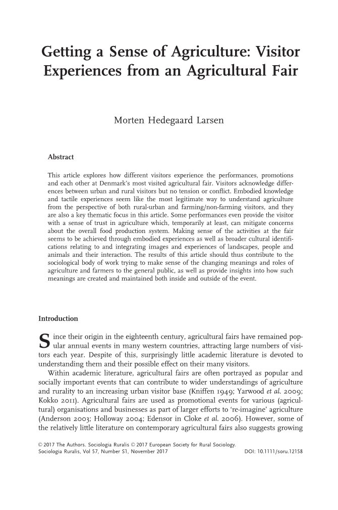 摘要:本文探讨了不同的游客如何在丹麦参观次数最多的农业博览会上体验表演、促销和 彼此。游客承认城乡游客之间的差异,但没有紧张或冲突。从城乡和非农业触觉游客的角度来看,体现其中的知识和触觉体验似乎是理解农业的最合法的方式,它们也是本文的主要主题。有些表演甚至为游客提供了一种对农业的信任感,至少,这暂时可以减轻人们对整个粮食生产系统的担忧。理解博览会上的活动似乎是通过具体化的体验以及更广泛的文化认同,以及结合景观、人和动物及其互动的图像和体 验来实现的。因此,本文的结果应该有助于社会学的著作主体,试图向一般公众理解农业和农民的不断变化的意义和角色,并提供关于这些意义是如何在事件内外被创造和维持的见解。
