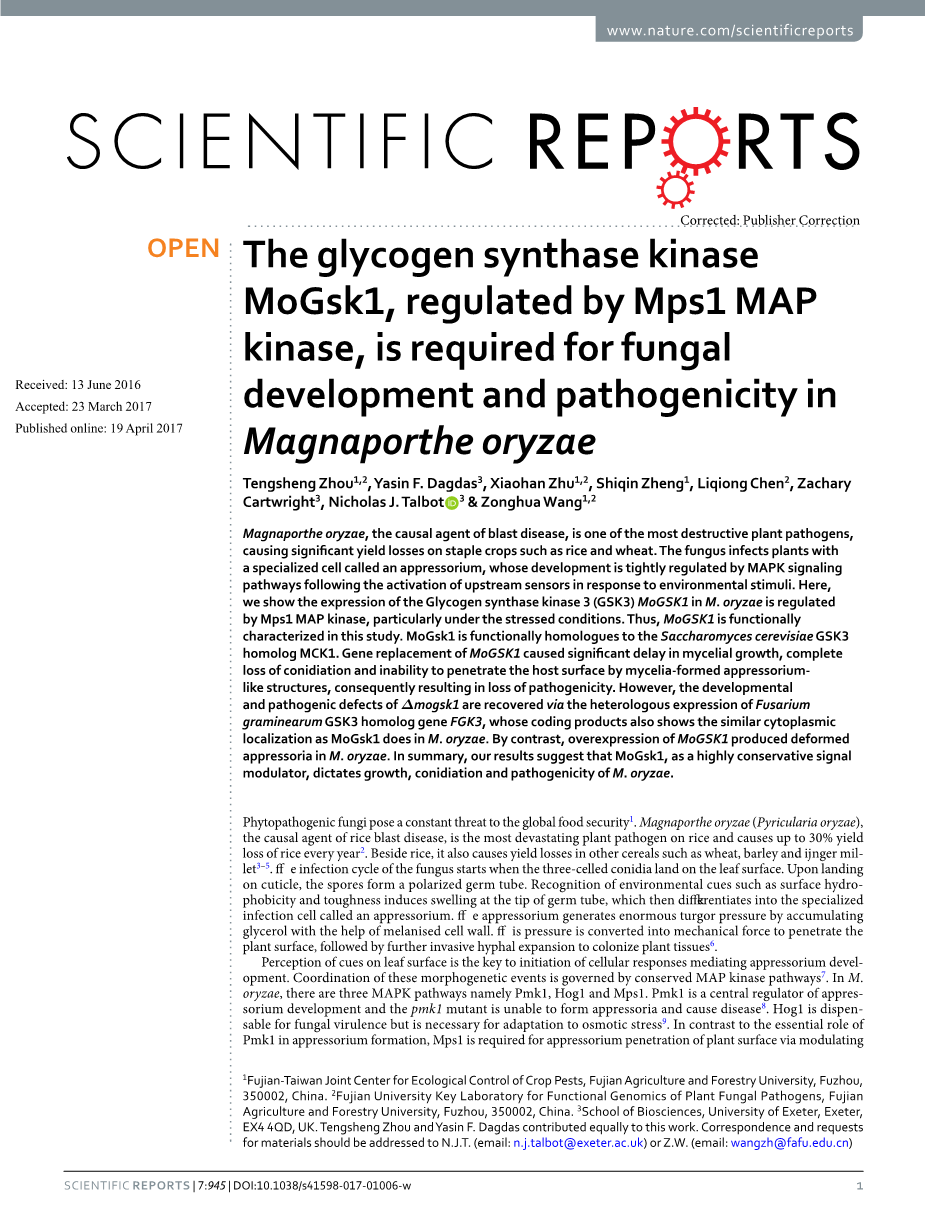 Tengsheng Zhou1,2, Yasin F. Dagdas3, Xiaohan Zhu1,2, Shiqin Zheng1, Liqiong Chen2, Zachary Cartwright3, Nicholas J. Talbot 3 amp; Zonghua Wang1,2
