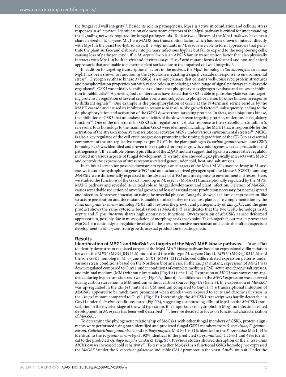 在对M. oyzae中Mps1 MAP激酶通路下游可能靶点的初步筛选中,我们发现在Mps1缺失和环境胁迫下,疏水蛋白基因MPG1和糖原合酶激酶3(GSK3)的同源物MoGSK1存在差异表达。在此,我们研究了M. oryzae 中GSK3同源物(MoGsk1)在MPS1 MAPK通路转录调控下的功能,揭示了其在真菌发育和植物感染中的关键作用。缺失mogsk1会显著降低菌丝生长,并导致正常传播和感染所必需的无性孢子产生的损失。此外,使用Delta;mogsk1的菌丝栓接种表明,该突变体未能穿透附着胞样结构,无法感染大麦或水稻寄主植物。互补小麦镰刀菌(Fusarium gramienearum)的同源基因FGK3完全恢复了Delta;mogsk1的生长和致病性,其基因产物表现出与MoGsk1相同的胞质定位。Tis表明在稻瘟病菌和禾谷霉具有高度保守的功能。MoGSK1的过表达导致附着区变形,这可能是由于形态发生检查点的失调。综上所述,我们的研究结果证明MoGsk1是一个参与应激反应机制的中央信号调节因子,控制M. oryzae从生长、无性繁殖到发病的多个发育方面。