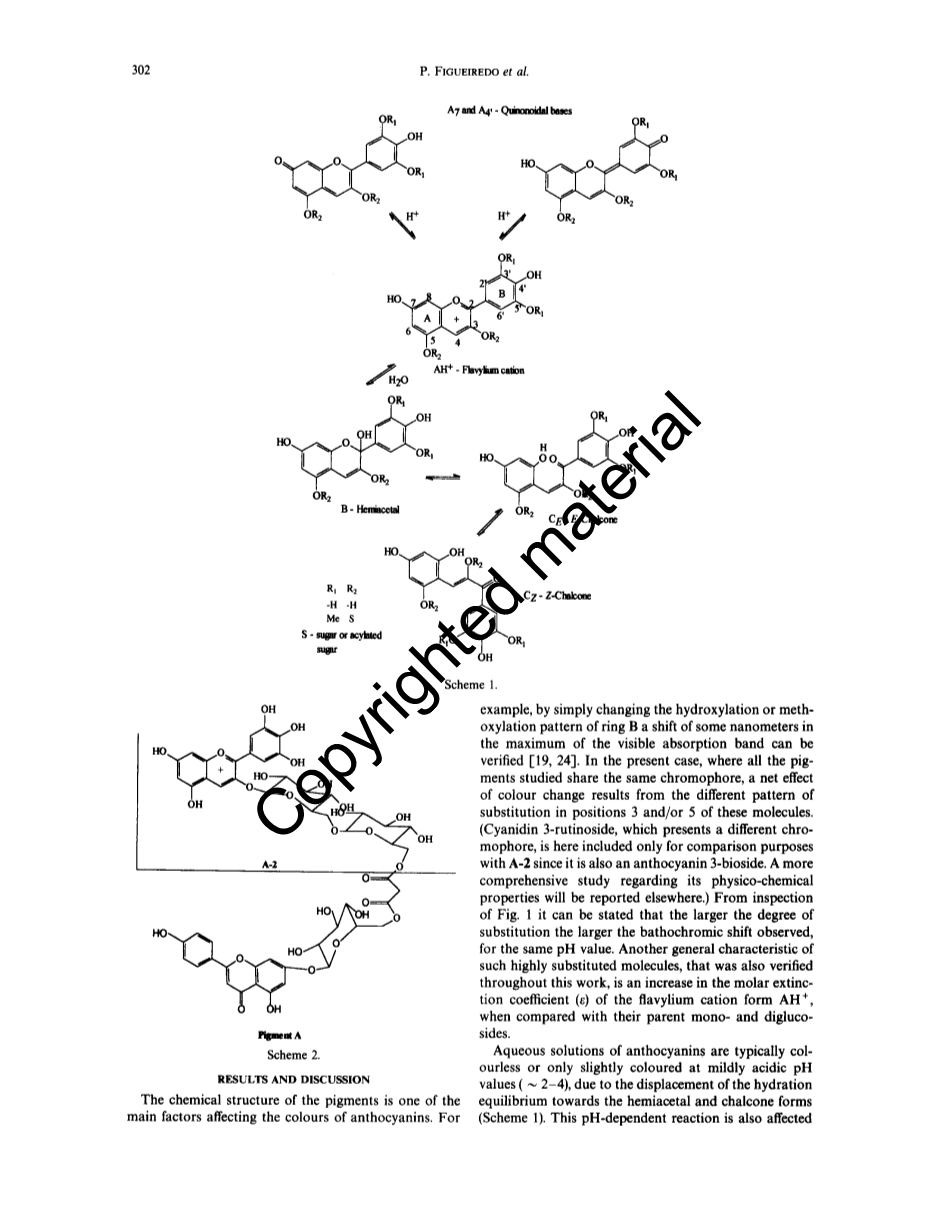 如上所述,本试验研究的两个系列中唯一具有不同行为的分子是A-2,其在位置3上仅有龙胆苷(一种线性双糖)作为取代基。与飞燕草素-3-葡萄糖苷相比,其黄素形式的电子吸收光谱显示摩尔吸收系数(ε)值急剧下降。这与通常在花色苷复合形式中发现的小的低色移形成对比,低色移是由分子间或分子内结合产生的[3]。然而,A-2吸收系数值的大幅度下降似乎是发色团第3位具有二糖作为唯一取代基的分子的一般特征,因为在另外两种同样具有3-生物生物糖苷残基的花色苷(车菊素-3-桑布双糖苷-5-葡萄糖苷(Figueiredo,P.等人未发表的结果)和矢车菊素-3-芸香糖苷)中也证实了类似的结果。