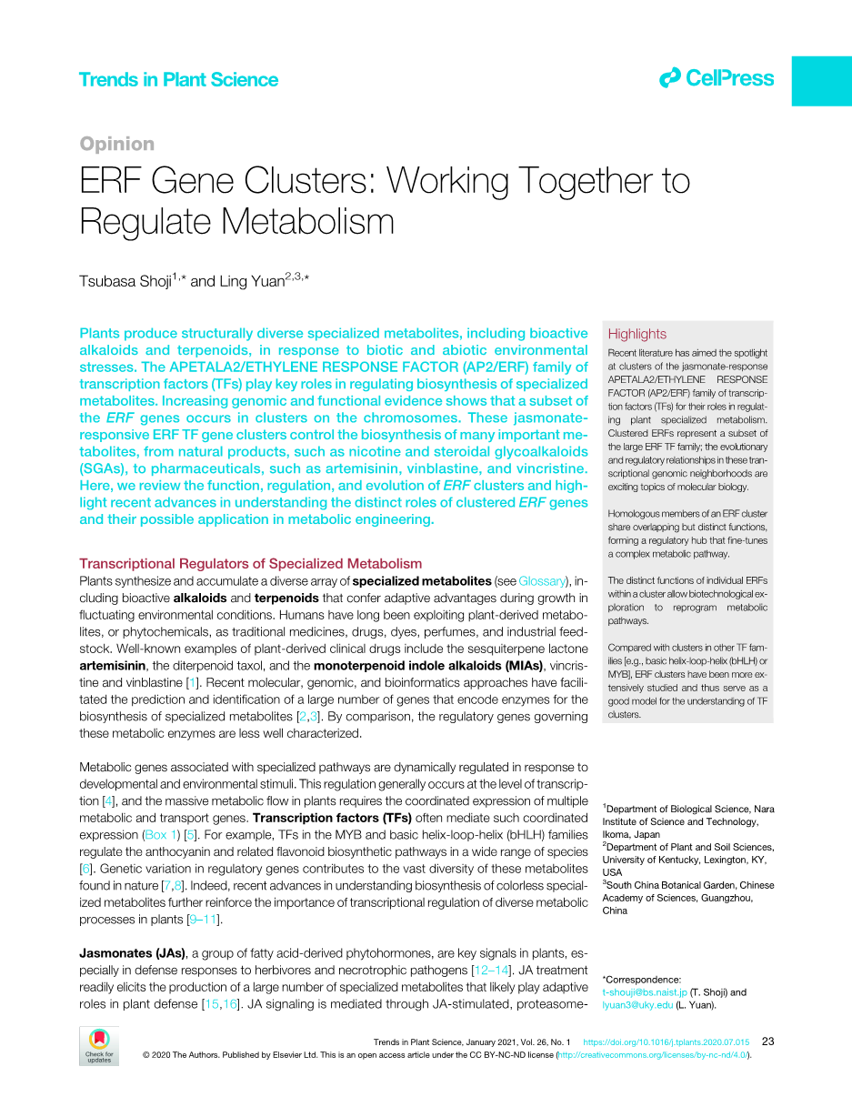 植物产生结构多样的特殊代谢物,包括具生物活性的生物碱和萜类化合物,以响应生物和非生物环境胁迫。APTALA2 /乙烯反应因子(AP2/ERF)转录因子(transcription factor, TFs)在调控特殊代谢物的生物合成中起关键作用。越来越多的基因组和功能证据表明,ERF 基因的一个子集以簇的形式出现在染色体上。这些茉莉酸响应性ERF转录因子基因簇调控着许多重要代谢物的生物合成,从天然产物,如尼古丁和甾体生物碱(SGAs),到人工药物,如青蒿素,长春碱,长春新碱。在此,我们综述了ERF簇的功能、调控机制和进化过程,并重点介绍了在理解簇ERF基因的不同作用及其在代谢工程中的可能应用方面的最新进展。