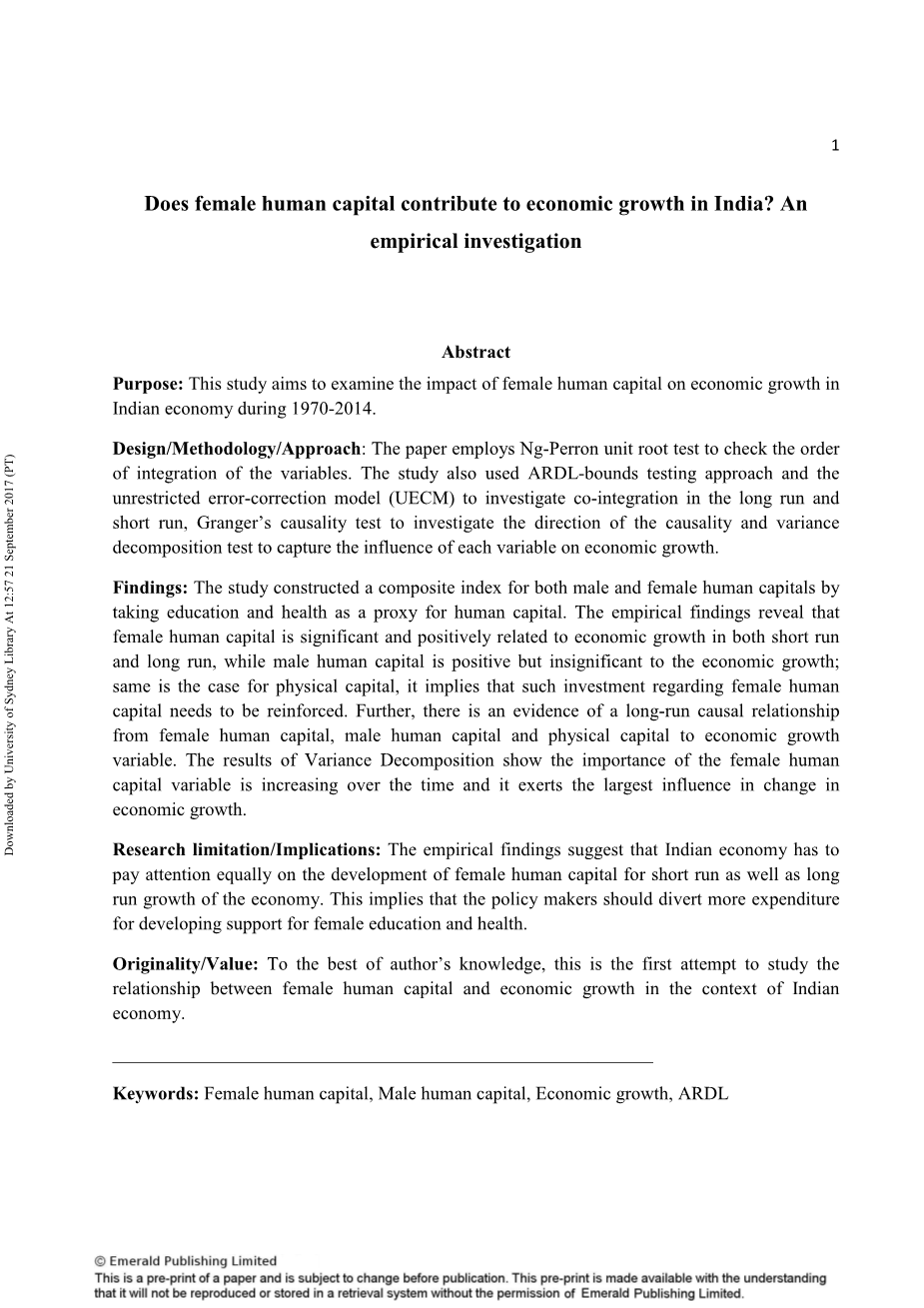 长期以来,人力资本作为经济发展来源的贡献一直是学者们感兴趣的问题。人力资本对经济增长的重要性在过去20年里一直是一个激烈讨论的话题。它包括从悉尼大学图书馆在2017年9月21日12:57(PT)下载的新古典主义研究,6个外生增长模型SOLOW(1956)和SWAN(1956)到内生增长模型罗默(1994),以现代计量经济学技术为基础的实证证据研究。