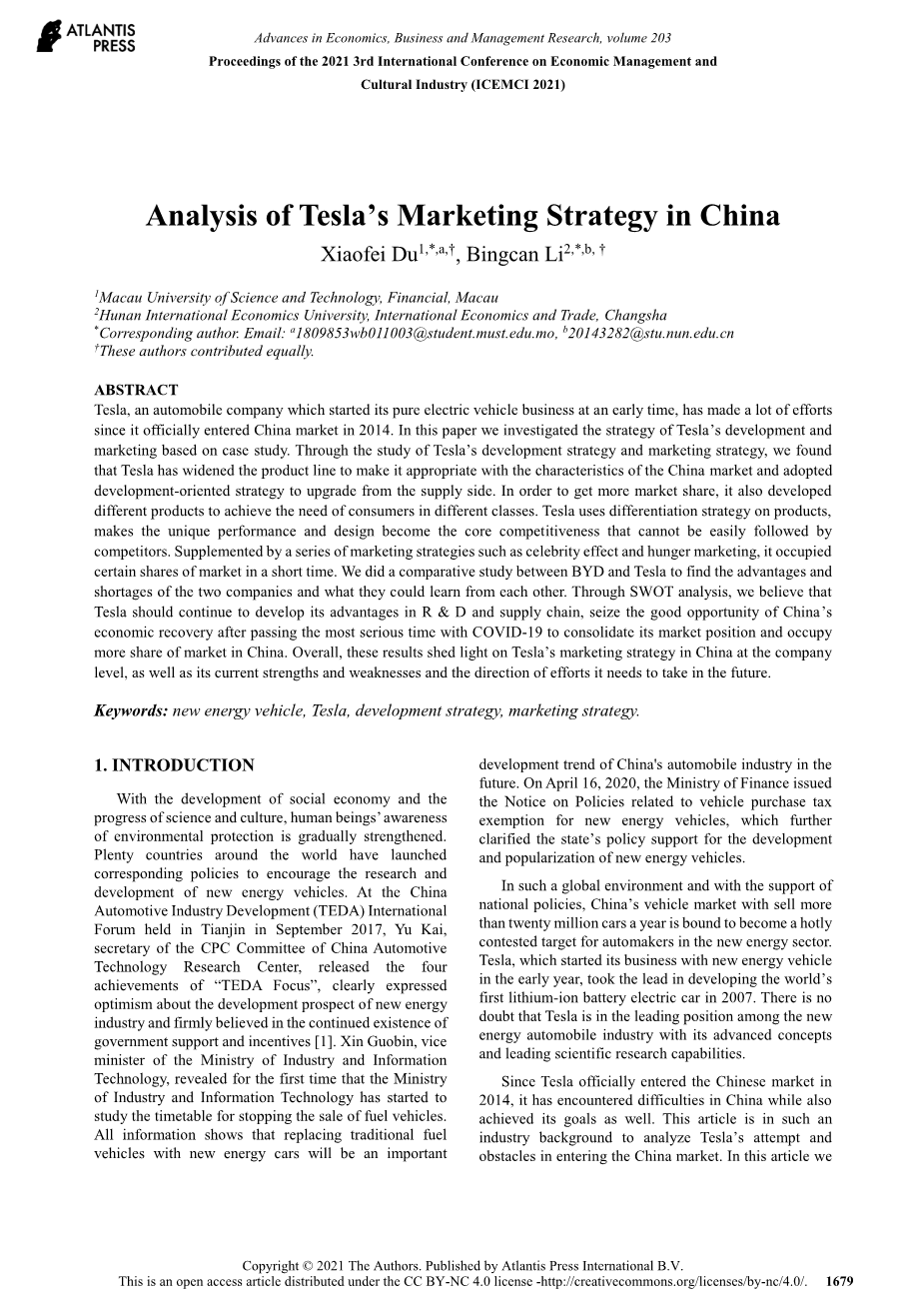 特斯拉是一家较早开展纯电动汽车业务的汽车公司,自2014年正式进入中国市场以来,已经做出了很多努力。本文通过案例研究,探讨了特斯拉的发展和营销策略。通过研究特斯拉的发展战略和营销策略,我们发现特斯拉拓宽了产品线,使之适合中国市场的特点,并采取发展导向型战略,从供给侧进行升级。为了获得更多的市场份额,它还开发了不同的产品来满足不同阶层消费者的需求。特斯拉在产品上采用差异化战略,使独特的性能和设计成为竞争对手无法轻易效仿的核心竞争力。辅以名人效应、饥饿营销等一系列营销策略,在短时间内占领了一定的市场份额。我们做了比亚迪和特斯拉的对比研究,寻找两家公司的优势和不足,以及可以相互学习的地方。