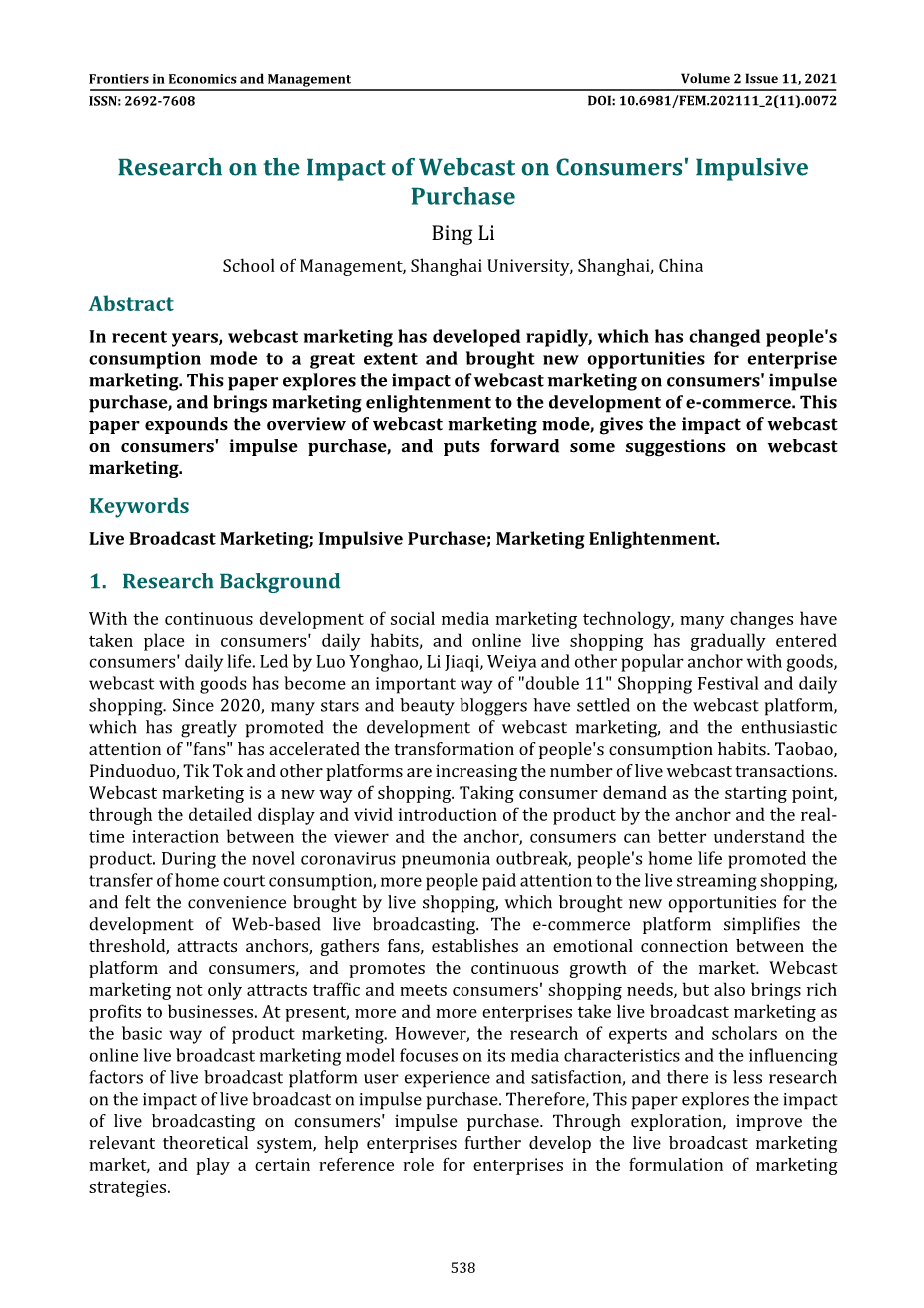 随着社交媒体营销技术的不断发展,消费者的日常生活习惯发生了许多变化,网上直播购物逐渐进入了消费者的日常生活。在罗永浩、李家琦、微亚等热播商品主持人的带领下,商品网络直播已经成为“双十一”购物节和日常购物的重要方式。2020年以来,众多明星和美女博主纷纷落户网络直播平台,极大地推动了网络营销的发展,“粉丝”的热情关注加速了人们消费习惯的转变。淘宝、拼多多、 tik tok 等平台都在增加网络直播交易的数量。网络营销是一种新的购物方式。以消费者需求为出发点,通过主持人对产品的详细展示和生动介绍,以及观众与主持人之间的实时互动,消费者可以更好地理解产品。在新型冠状病毒肺炎爆发期间,人们的家庭生活促进了家庭消费的转移,更多的人关注直播购物,感受到直播购物带来的便利,为网络直播的发展带来了新的机遇。电子商务平台简化了门槛,吸引了主持人,聚集了粉丝,在平台与消费者之间建立了情感联系,促进了市场的持续增长。网上营销不但能吸引流量,满足消费者的购物需要,更能为企业带来丰厚的利润。目前,越来越多的企业将直播营销作为产品营销的基本方式。然而,专家学者对网络直播营销模式的研究主要集中在直播平台的媒体特征及其用户体验和满意度的影响因素上,而对直播对冲动性购买的影响的研究较少。因此,本文探讨了直播对消费者购买冲动的影响。通过探索,完善相关理论体系,帮助企业进一步开拓直播营销市场,为企业制定营销战略发挥一定的参考作用。