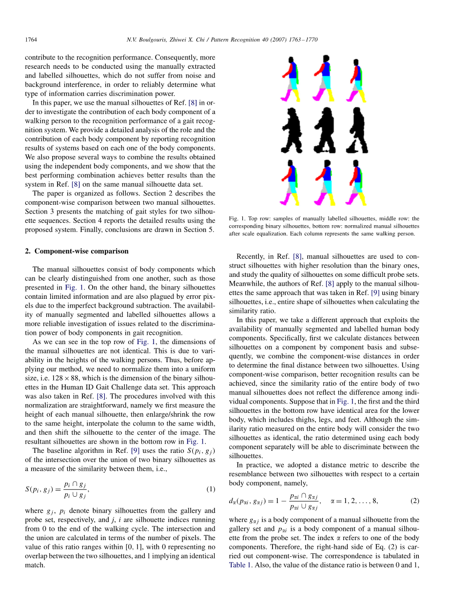 本文的结构如下。第2节描述了手动轮廓的部位比较,人体不同的部位被分别研究,并被证明就有不同的辨别能力。第3节介绍了轮廓序列步态样式的匹配。第4节报告了轮廓序列识别的结果。第5节中得出结论。