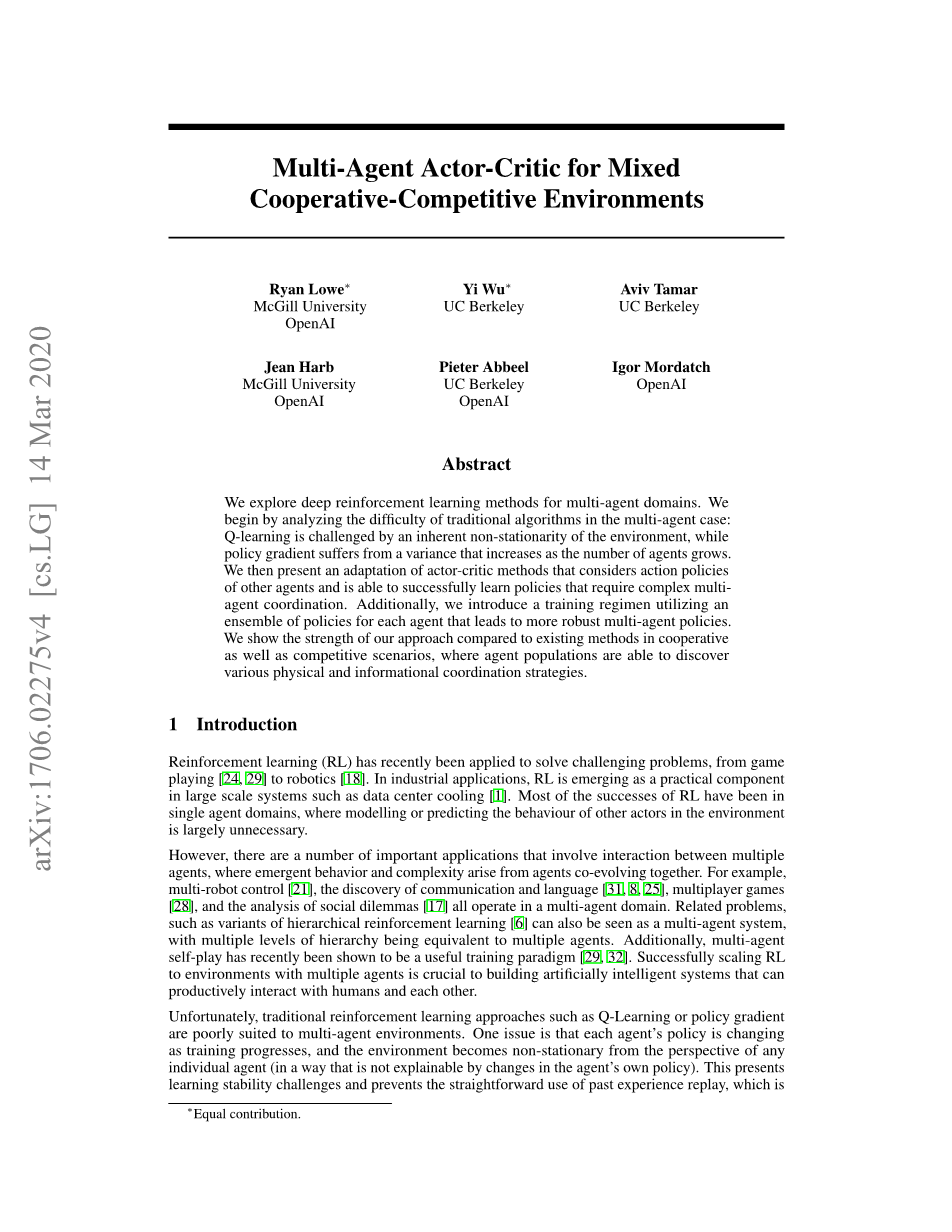 我们采取分散执行,集中训练的框架,使policy能使用额外的信息来缓解训练压力,只要这些信息在测试时间没有使用。Q-learning是天然无法胜任,如果不对环境做一些额外的结构上的假设,因为Q函数一般来说是不能在训练和测试的时候包含不同的信息的。因此,我们提出了一种 actor-critic policy gradient方法的简单的扩展,critic增加了其他智能体的policy的额外信息,actor则只能接触到本地的信息(也就是该智能体自身的)。训练完成后,只有local actor在执行阶段使用,以分散的方式执行,同样适用于合作和竞争环境。由于集中的critic函数明确地使用了其他智能体的policy,我们额外地展示了智能体可以在线学习其他代理人的近似模型并有效地用到他们自己的policy学习过程中去。我们还会介绍一种提高多智能体policies稳定性的方法,通过policies的集成,因此这需要强有力的互动与各种合作者和竞争对手的policy。我们通过实验显示出我们方法相比现有的方法在合作以及竞争的环境下的优越性,在这种环境下,智能体群体能够发现复杂的物理和交流协调策略。