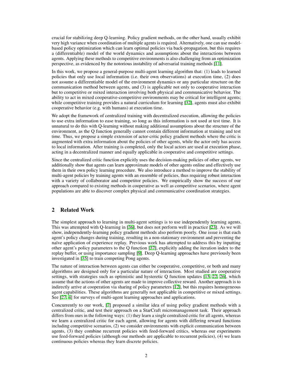 与我们的工作同时,[7]提出了一个类似的想法,使用policy gradient的方法以及集中的critic,并在星际争霸的微观控制任务上测试了他们的方法。他们的方法在以下方面与我们有所不同:(1)他们为所有的智能体只学习了一个单一的中央critic,而我们为每个智能体都学习了一个集中的critic,这允许具有不同奖励函数的智能体,包括在竞争环境下(2)我们考虑了智能体之间有明确通信的环境,(3)他们将周期性policy与前馈critic结合起来,而我们的实验则是使用前馈policy(虽然我们的方法适用于周期性policy),(4)我们学习的是连续的policy,而他们学习的是离散的。