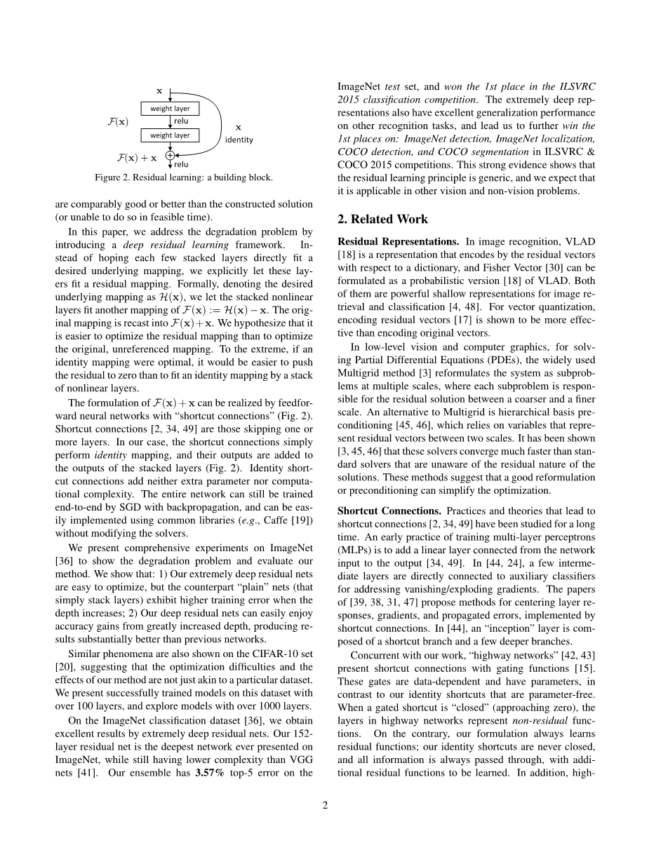 我们对每几个层叠的层次采用残差学习。图2中展示出了一个积木块(building block )。形式上,在本文中,我们考虑了一个积木块被定义为: