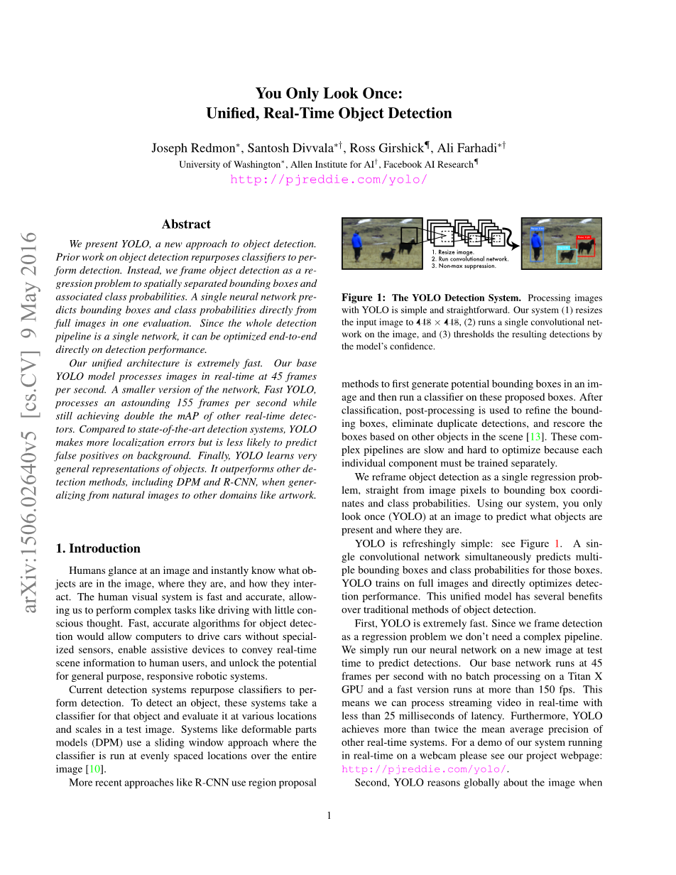 我们介绍一种新的物体检测方法YOLO。与先前的物体检测方法是重新设置分类器来执行检测不同,我们将物体检测方法看做一个回归问题,去预测空间分离的边界框和相关类别概率。单个神经网络从整个图片中一次性预测边界框和类别概率。由于整个检测流程是一个单一网络,所以可以进行端到端的直接对检测性能进行优化。