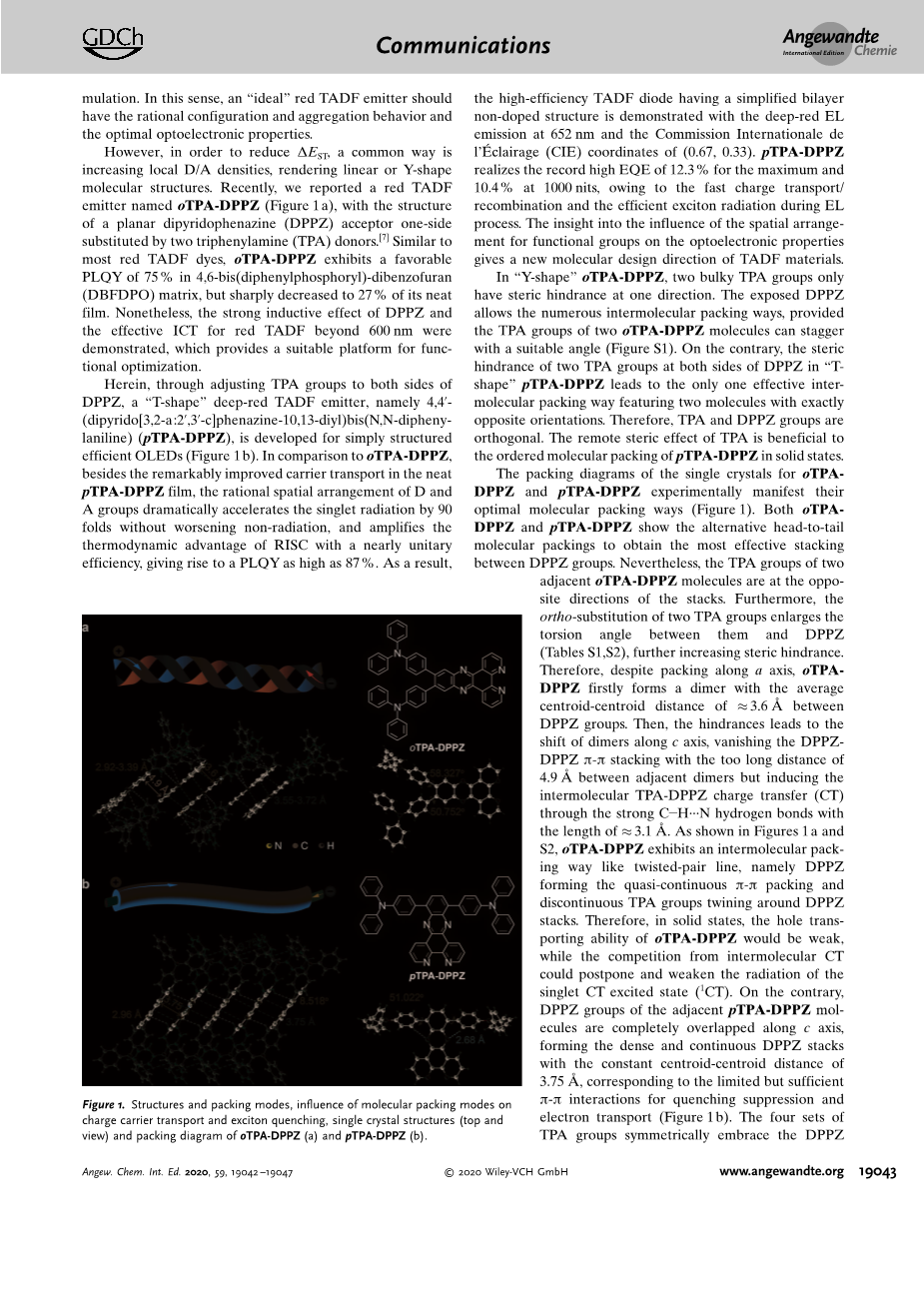 因此,一个主要的挑战是,简化的非掺杂红色TADF二极管对发射器提出了限制性要求。(i) 合理的分子包装与适当的分子间相互作用,以实现有效的载流子传输和淬灭抑制;(ii) 辐射比非辐射在高光致发光量子产率(PLQY)方面具有压倒 性优势;(iii) RISC的热动态优势,其效率接近100%,用于延迟荧光增强;(iv) 快速充电 重组和激子辐射,以避免激子的累积。在这个意义上,一个 '理想的 '红色TADF发射器应该具有合理的配置和聚集行为以及最佳的光电特性。