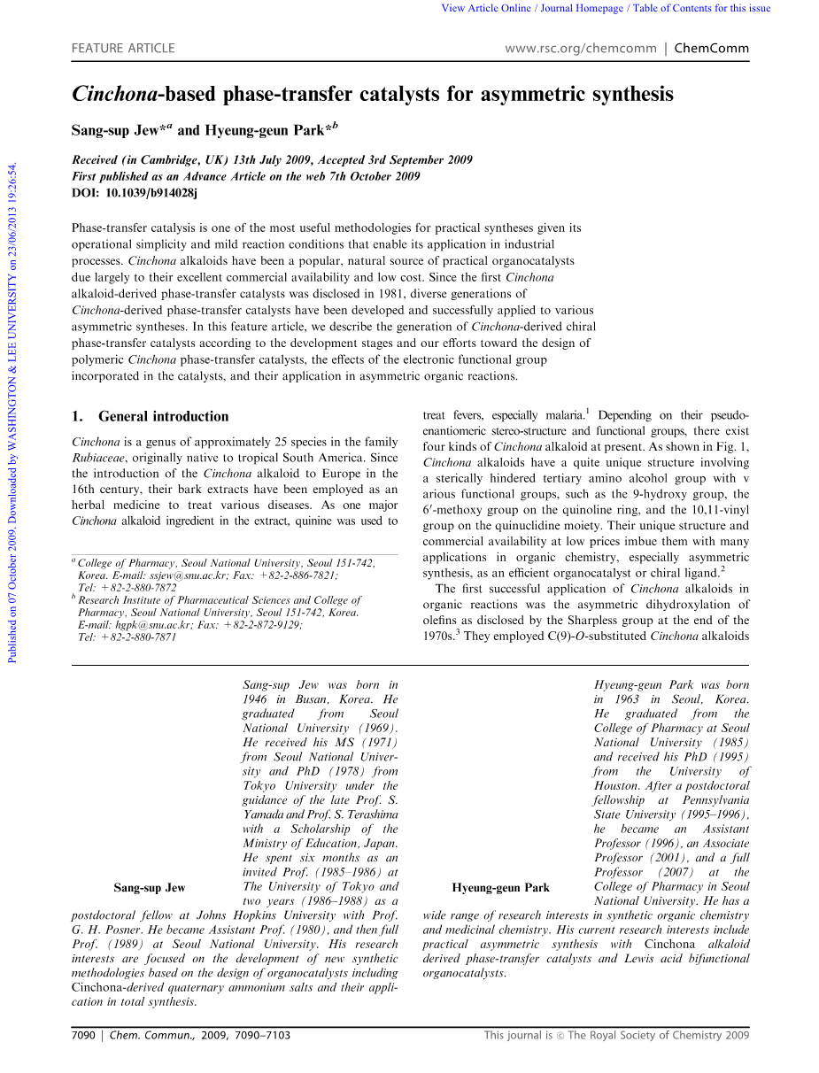 不对称合成。在这篇专题文章中,我们描述了金鸡纳衍生手性的产生