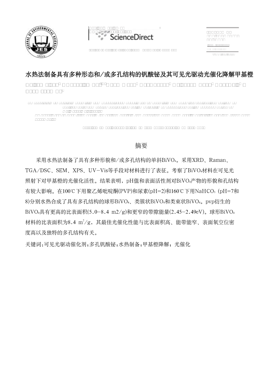Keywords: visible-light-drivencatalyst; porousbismuthvanadate; hydrothermalfabrication; MethylOrangedegradation; photocatal-ysis
