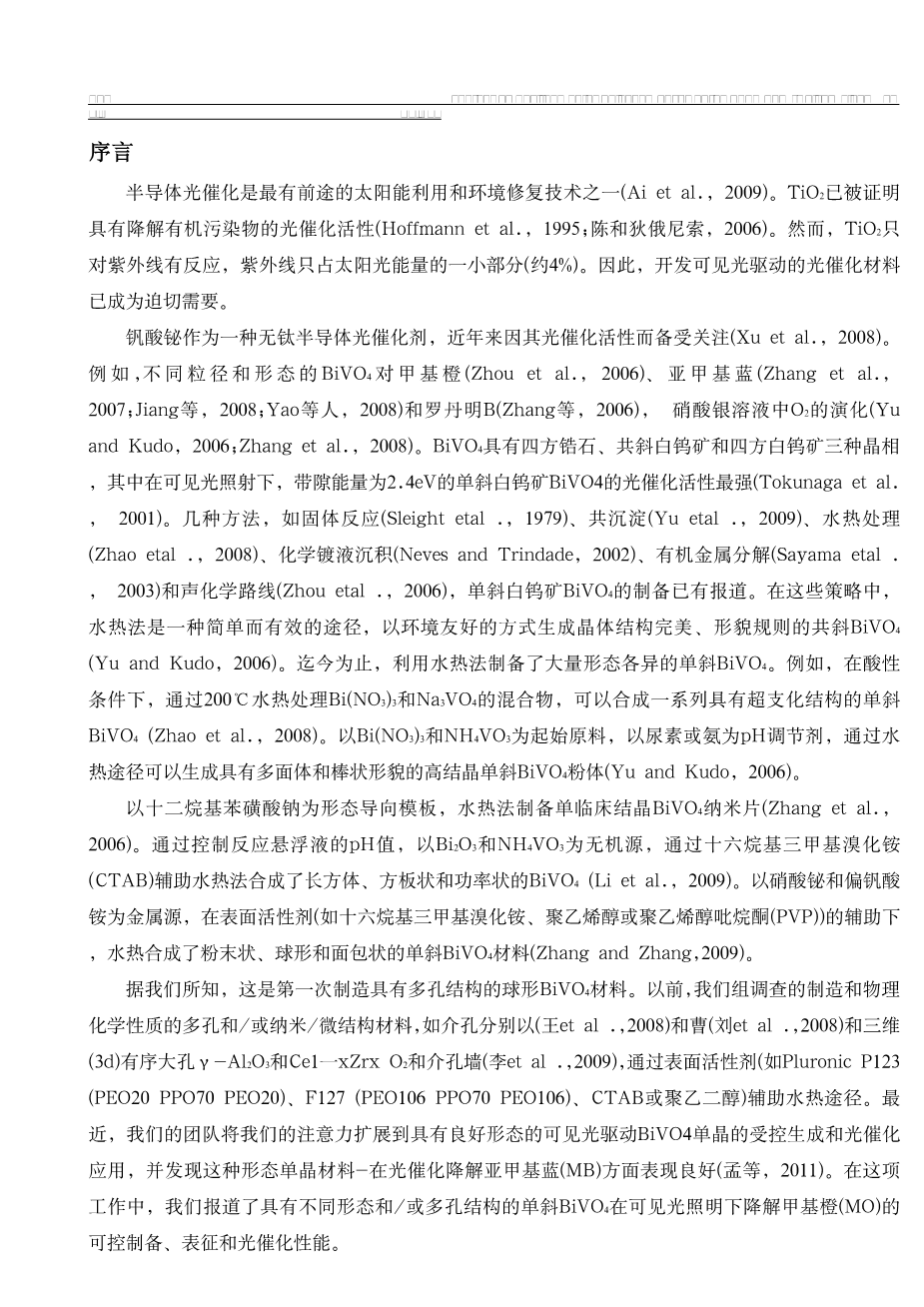 Tothebestofourknowledge, itistheirsttimeto fabricatesphericalBiVO4 materialwithaporousstructure. Previously, ourgroupinvestigatedthefabricationand physicochemicalpropertiesofanumberofporousand/or nano/microstructuredmaterials, suchasmesoporousMgO (Wangetal., 2008) andCaO (Liuetal., 2008), and three-dimensional (3D) orderedmacroporous gamma;-Al2 O3 and Ce1一xZrxO2 withmesoporouswalls (Lietal., 2009b),via thesurfactant(e.g., PluronicP123 (PEO20 PPO70 PEO20 ), F127 (PEO106 PPO70 PEO106 ), CTABorpolyethylene glycol)-assistedhydrothermalroute. Recently, ourgroup extendedourattentiontothecontrolledgenerationand photoc